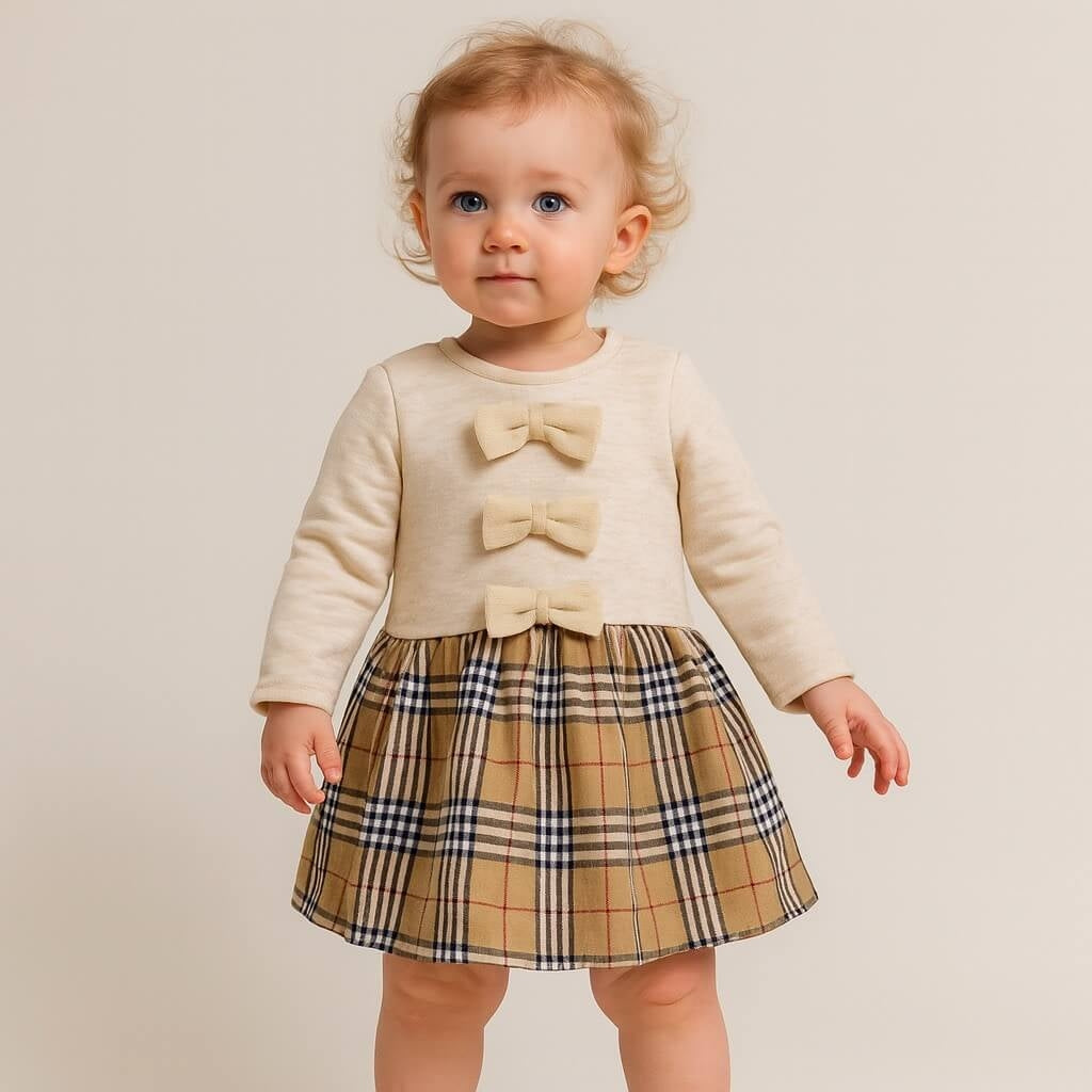 Un delizioso abitino pensato per le più piccole, caratterizzato da un corpino morbido e confortevole arricchito da tre fiocchetti applicati sul davanti. La gonna presenta una fantasia a quadri elegante e senza tempo, ideale per creare un look raffinato e adatto a ogni occasione.