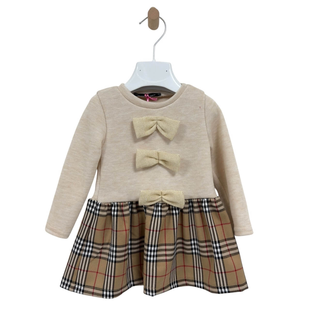 Un delizioso abitino pensato per le più piccole, caratterizzato da un corpino morbido e confortevole arricchito da tre fiocchetti applicati sul davanti. La gonna presenta una fantasia a quadri elegante e senza tempo, ideale per creare un look raffinato e adatto a ogni occasione.