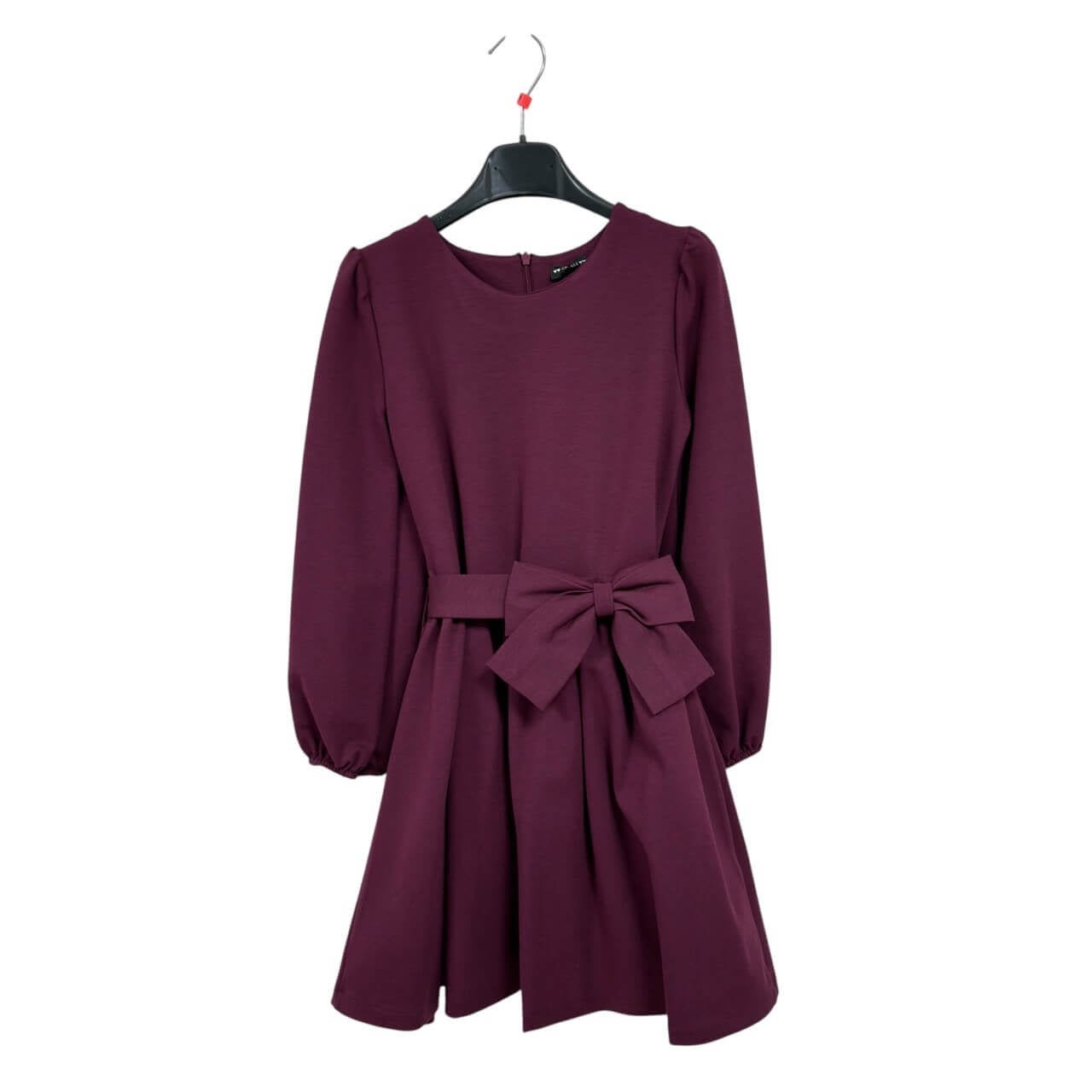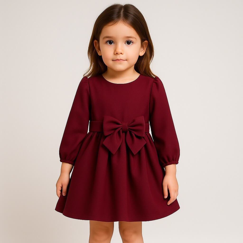 Abito elegante per bambina con linea svasata e maniche lunghe leggermente arricciate sul fondo. Il modello presenta un corpino semplice e raffinato, impreziosito da un grande fiocco applicato in vita che dona un tocco romantico e distintivo. La cintura integrata valorizza la silhouette e definisce la gonna ampia e morbida. Chiusura posteriore pratica per un indosso confortevole. Perfetto per cerimonie, feste e occasioni speciali.