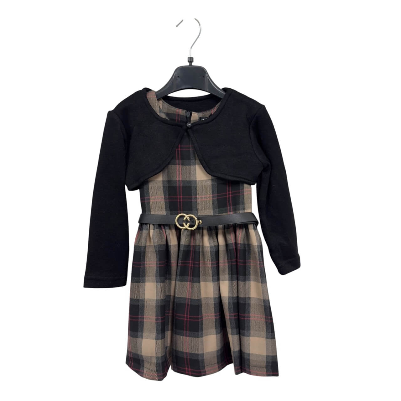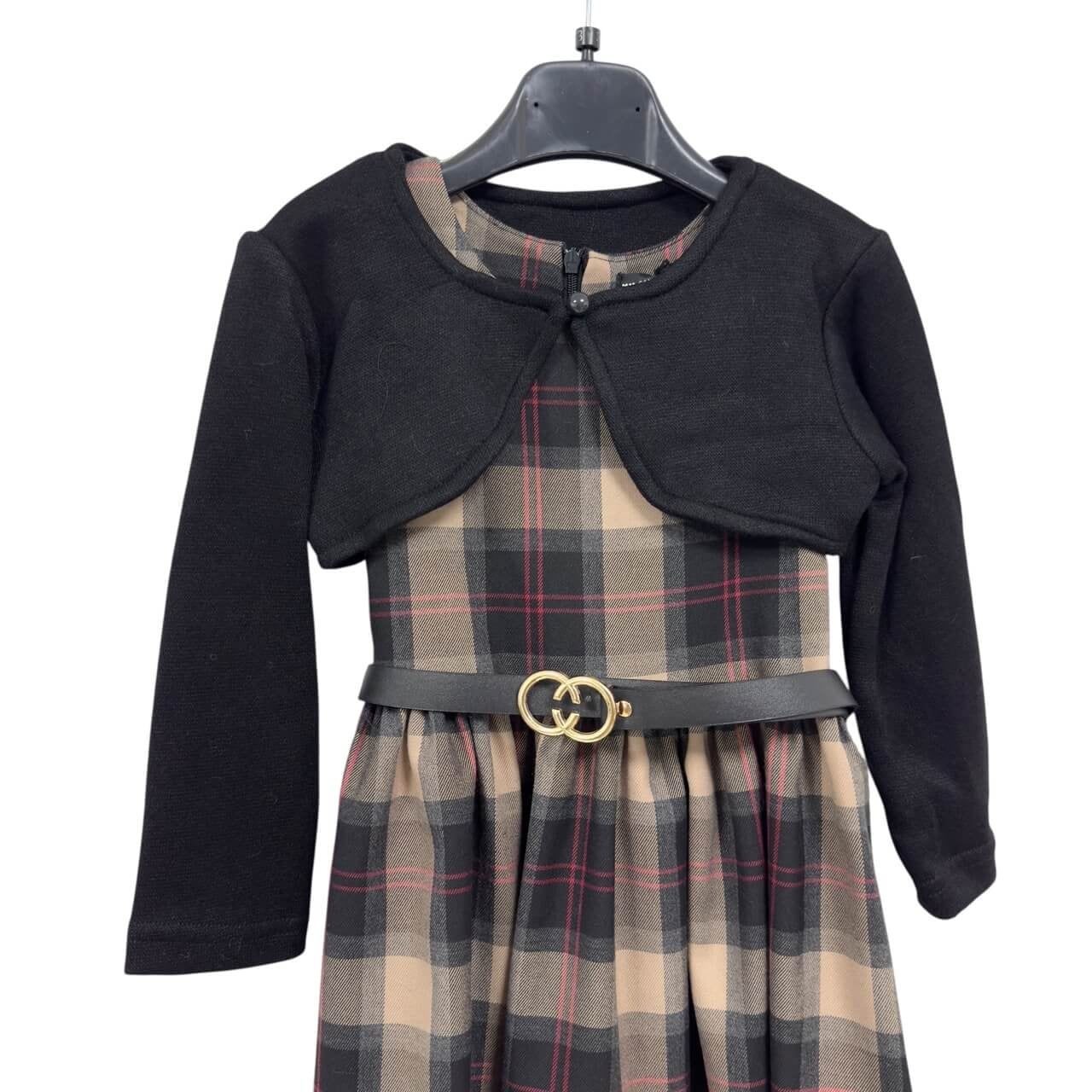 Abito a quadri scozzesi nei toni del beige, nero e rosso, con linea svasata e vestibilità comoda