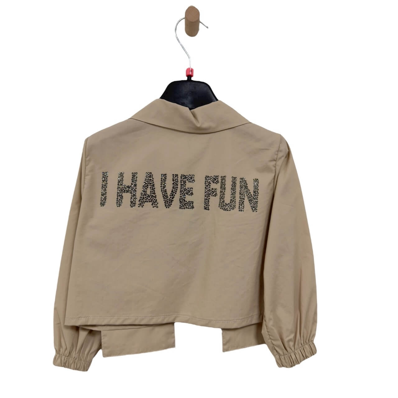 Camicia dal taglio corto con colletto classico e chiusura frontale con bottoni. Le ampie tasche applicate donano un tocco moderno e pratico, mentre la parte posteriore è impreziosita dalla scritta “I HAVE FUN” realizzata con piccoli dettagli decorativi. Le maniche lunghe con polsini elasticizzati completano il design, garantendo comfort e stile in ogni occasione.