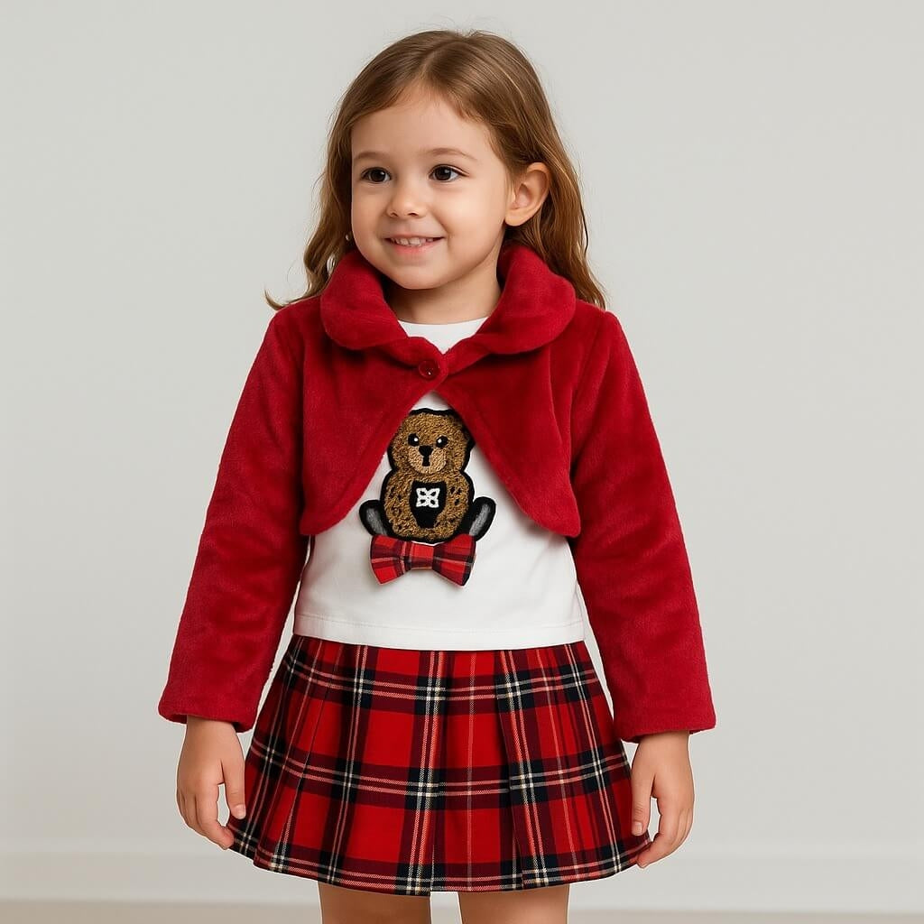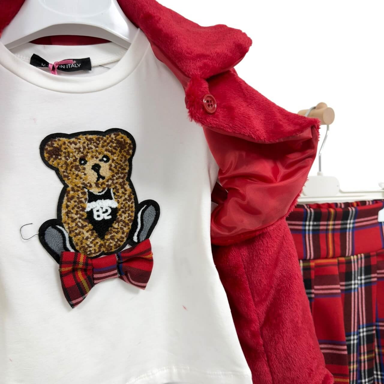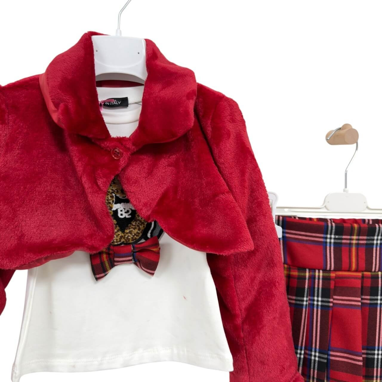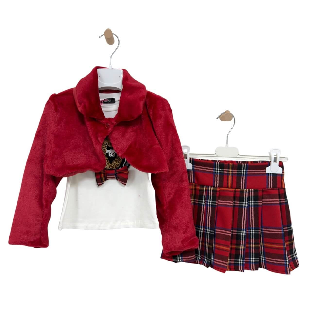 Coordinato 3 pezzi con giacchina pelosa, t-shirt e gonna a pieghe