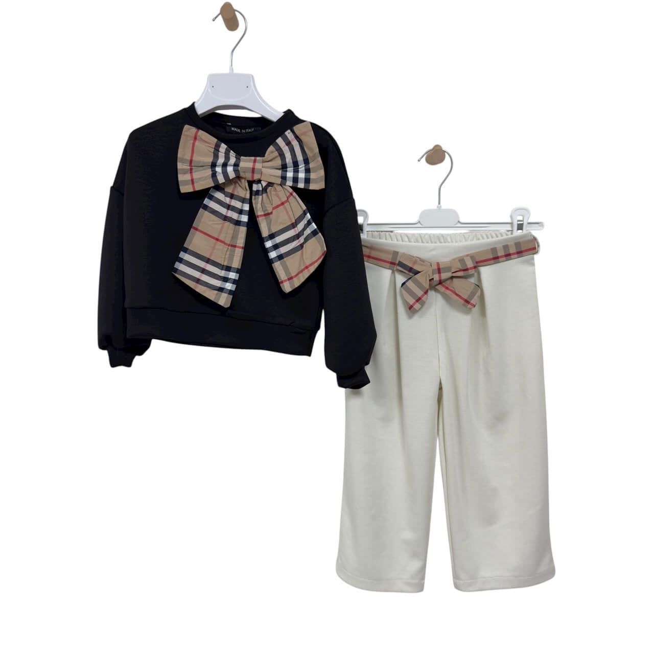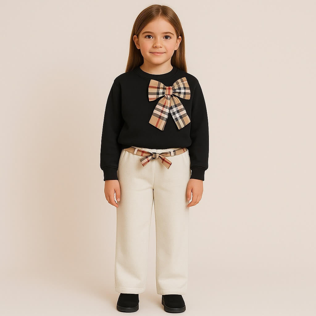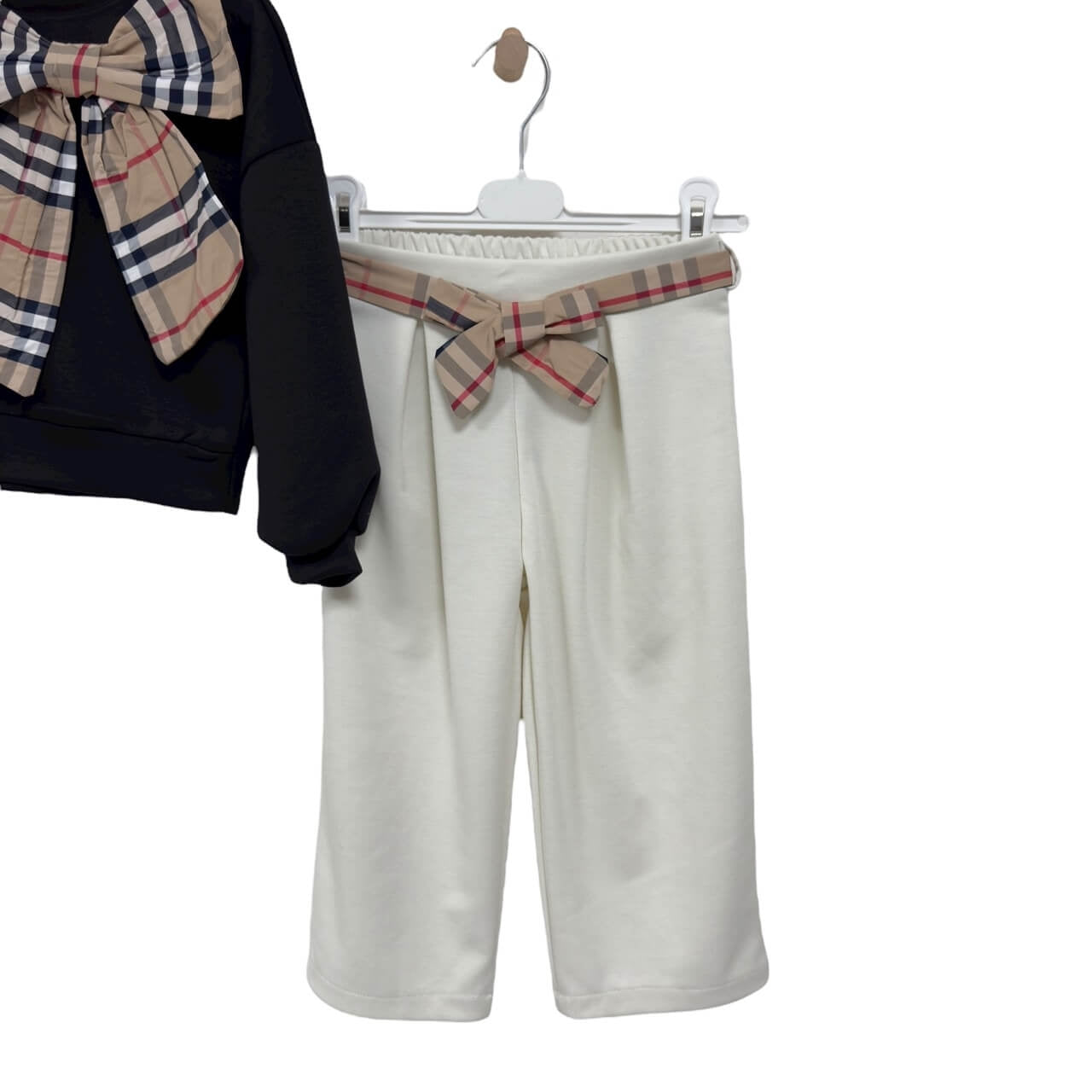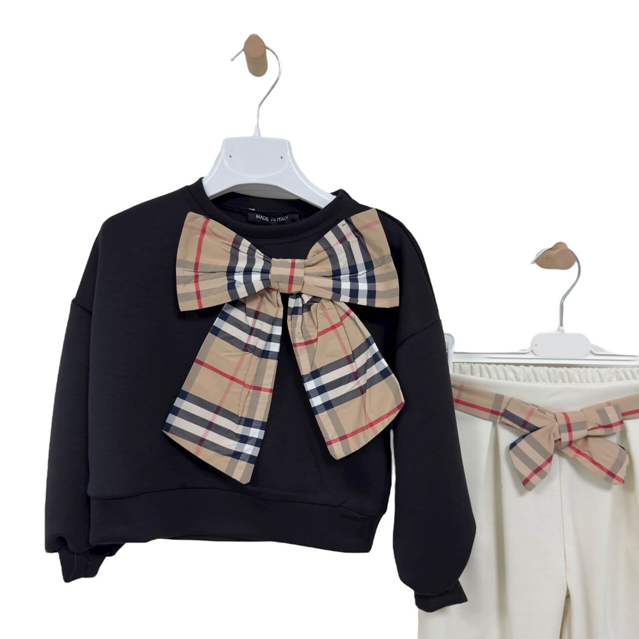 Felpa panna a maniche lunghe con maxi fiocco applicato in fantasia check scozzese, che dona un tocco chic e raffinato.