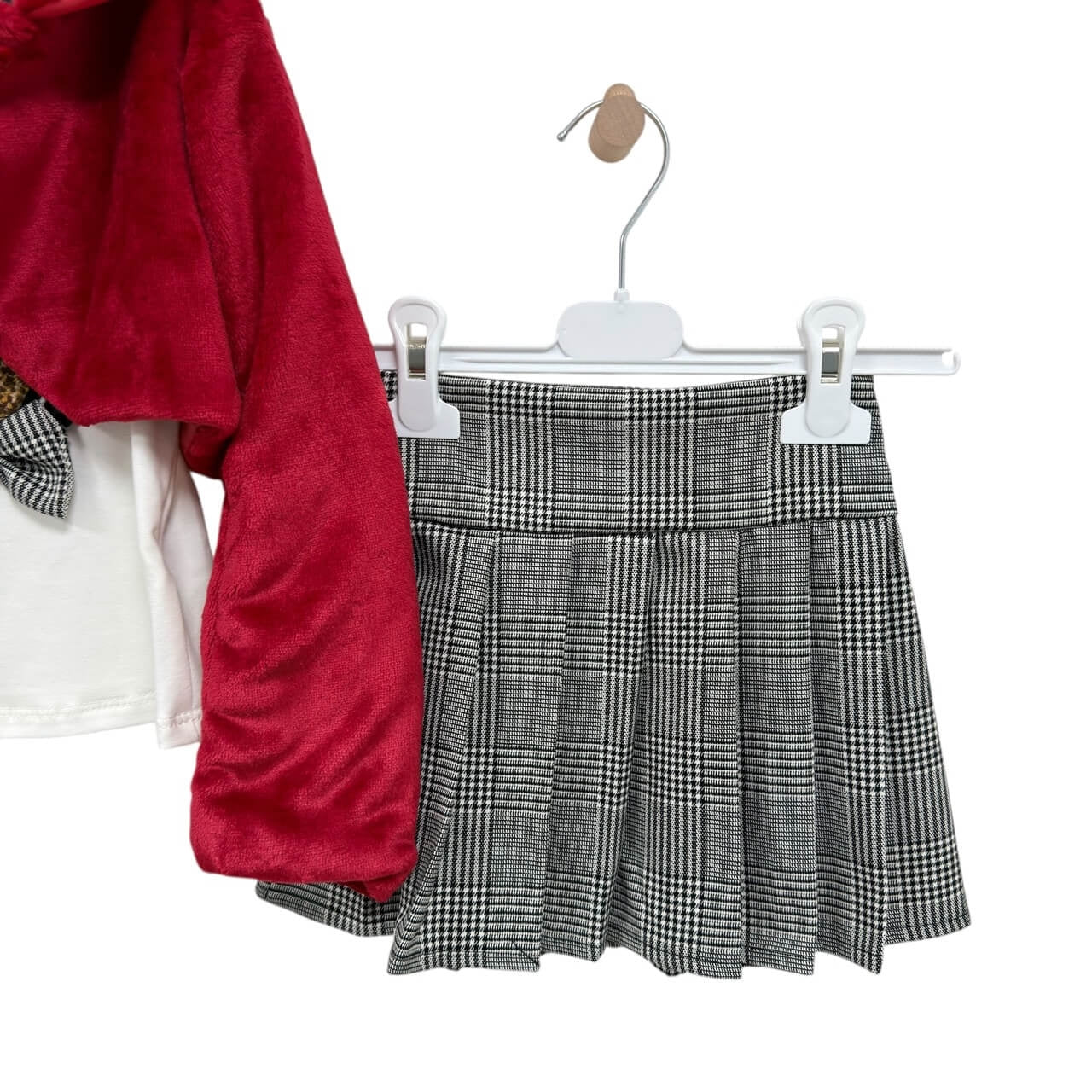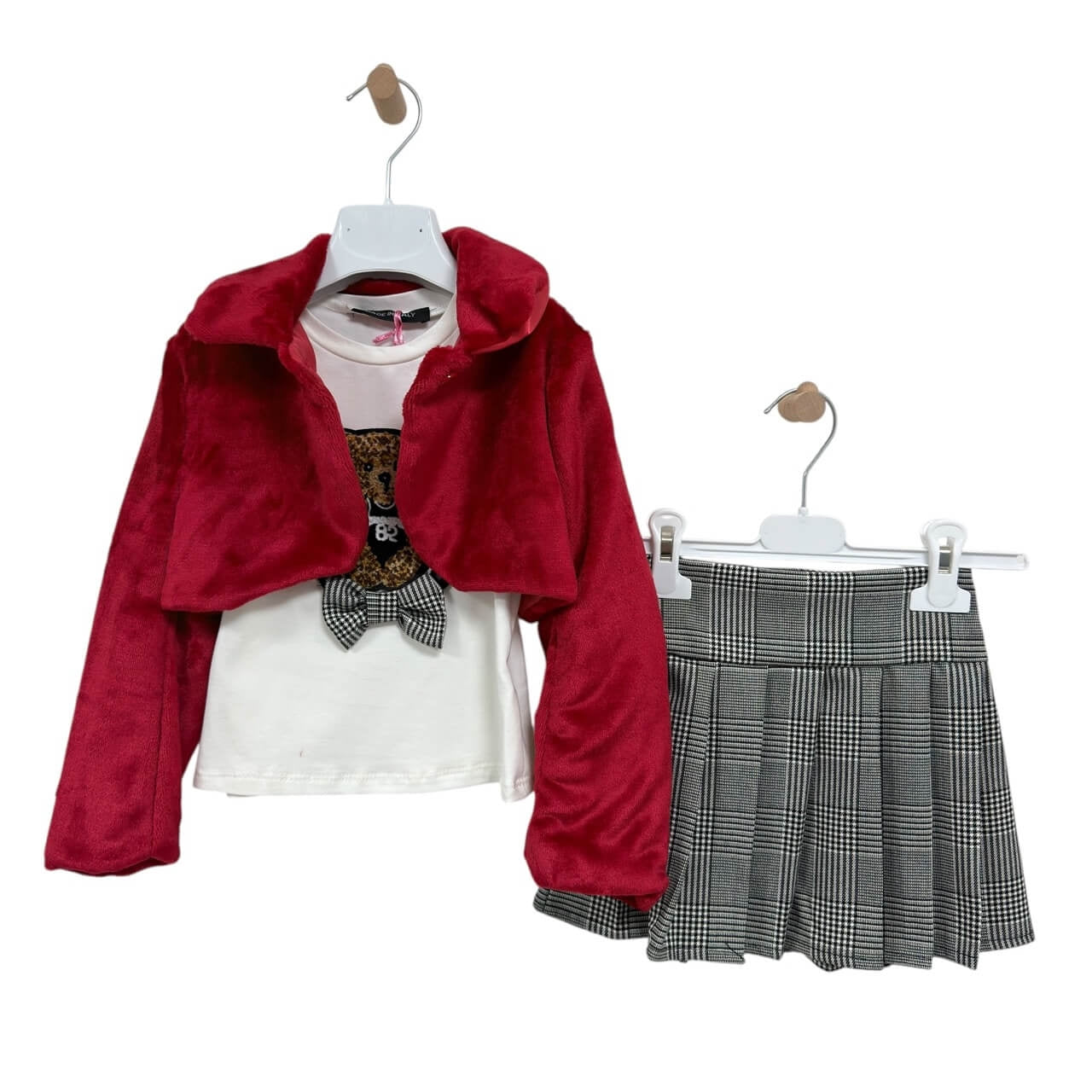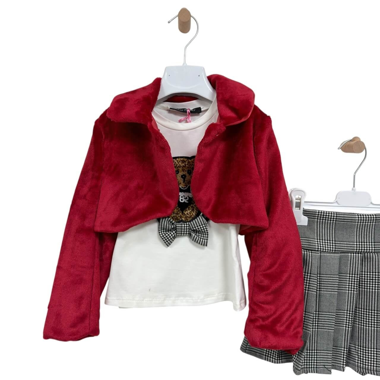 Coordinato 3 pezzi con giacchina pelosa, t-shirt e gonna a pieghe
