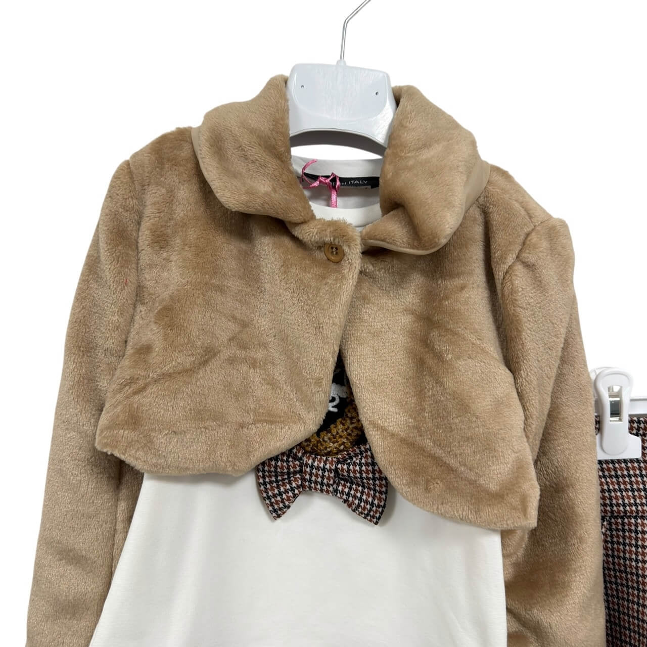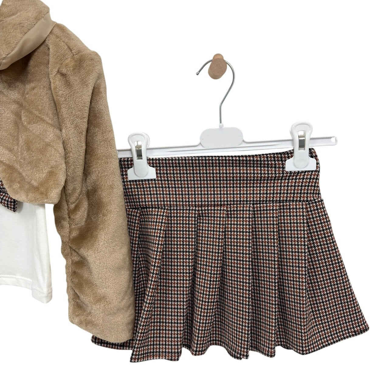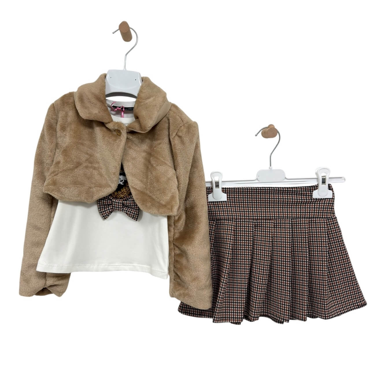 Coordinato 3 pezzi con giacchina pelosa, t-shirt e gonna a pieghe