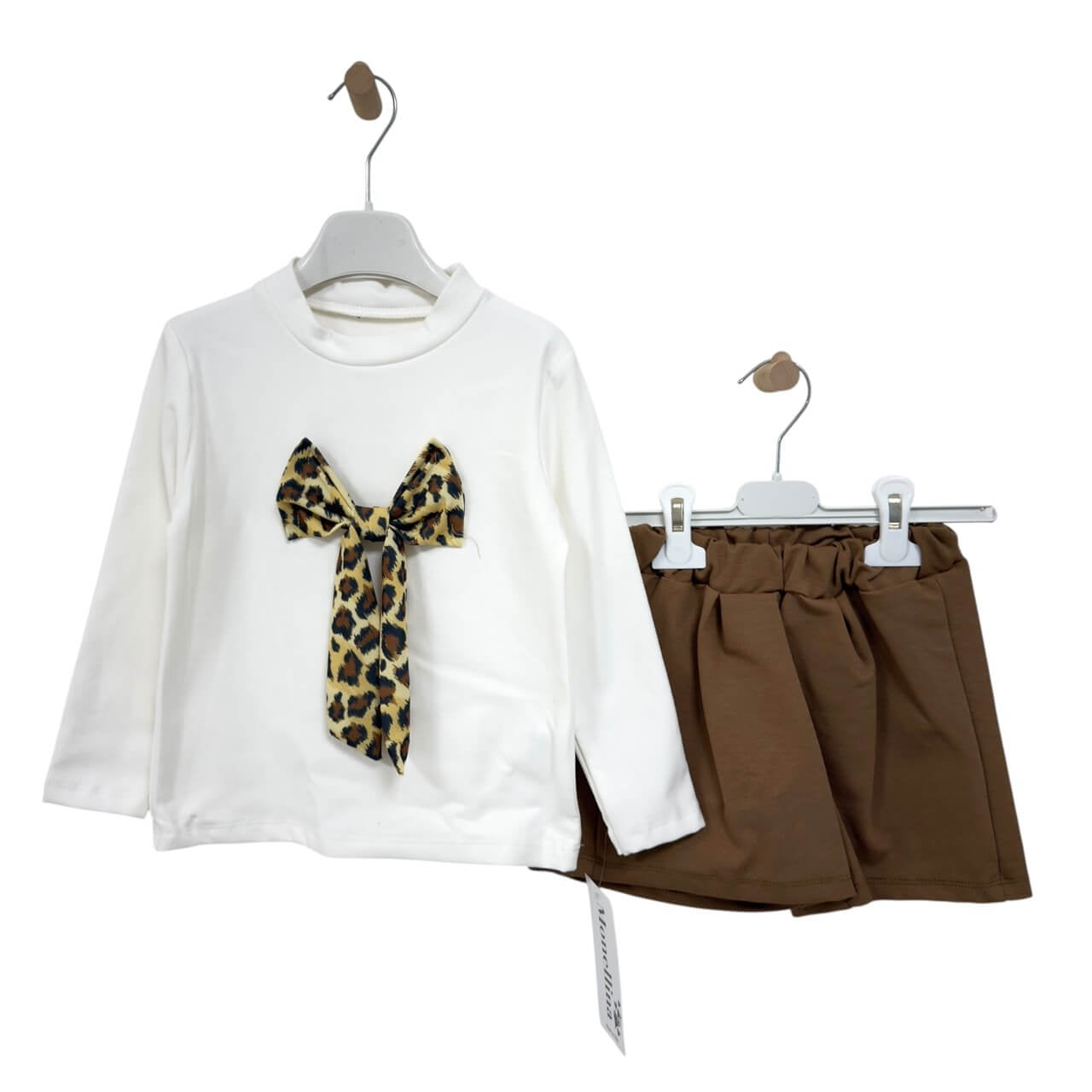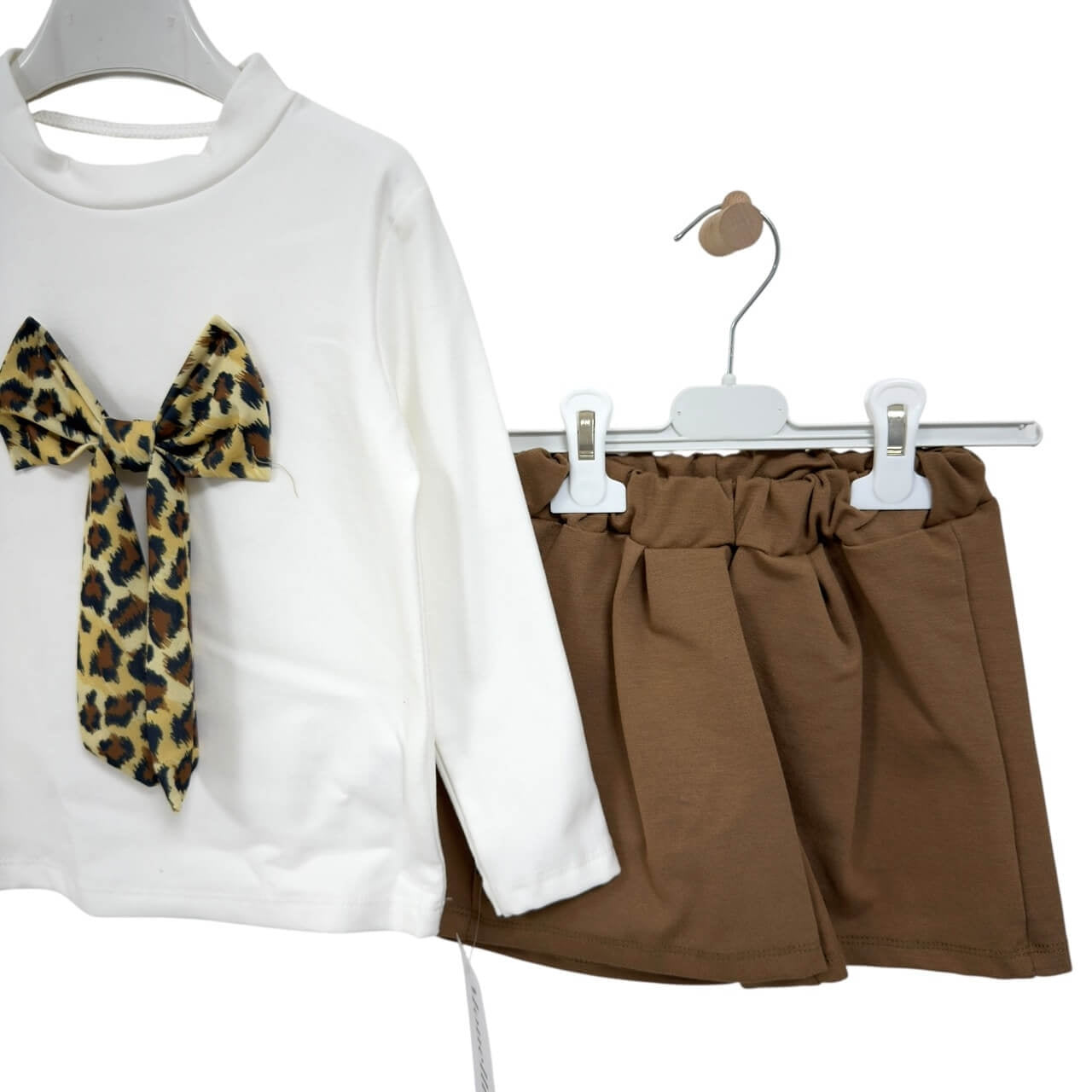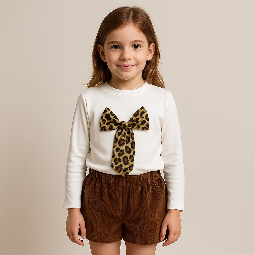 Maglia panna a maniche lunghe con maxi fiocco in fantasia animalier leopardata sul davanti.
