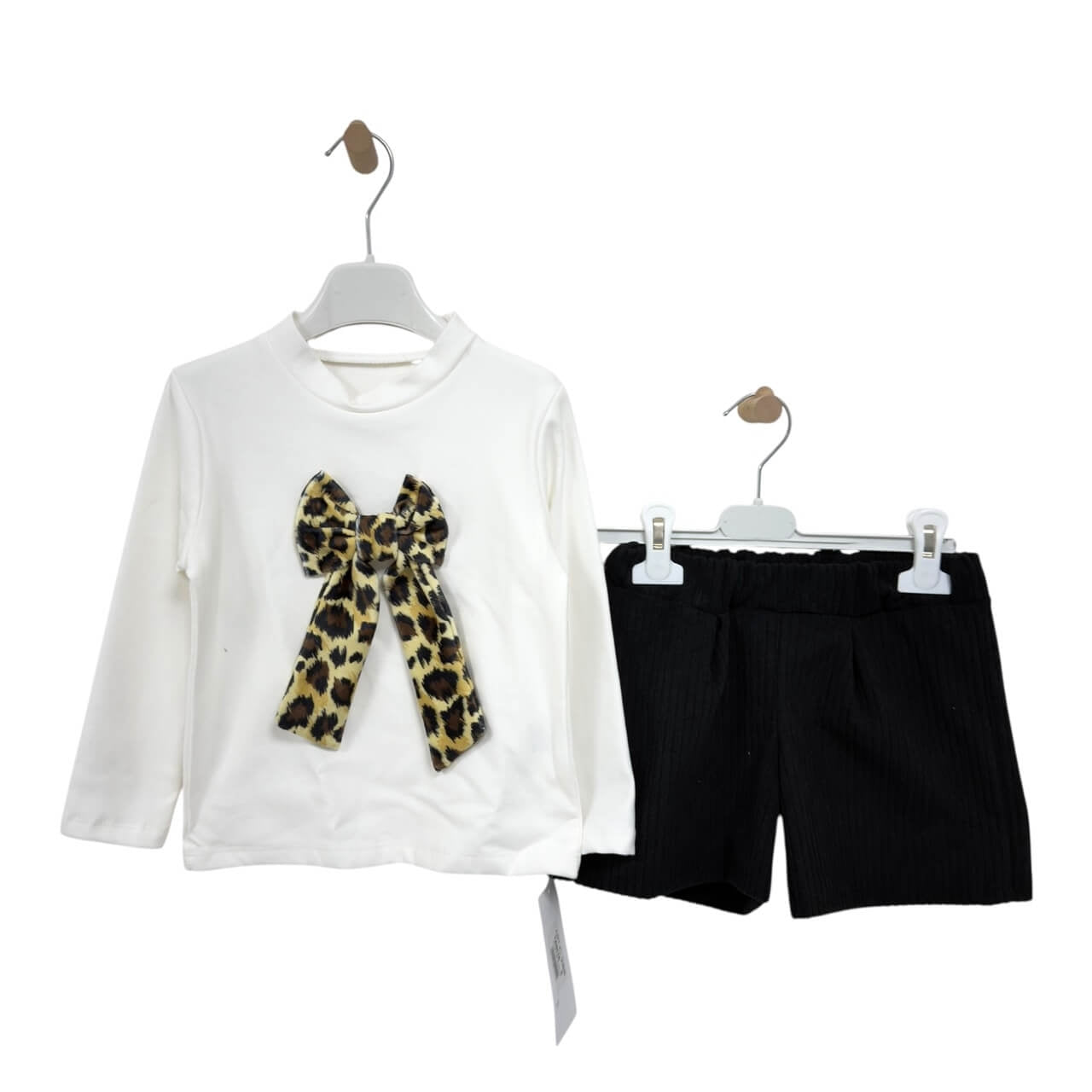 Maglia panna a maniche lunghe con maxi fiocco in fantasia animalier leopardata sul davanti.
