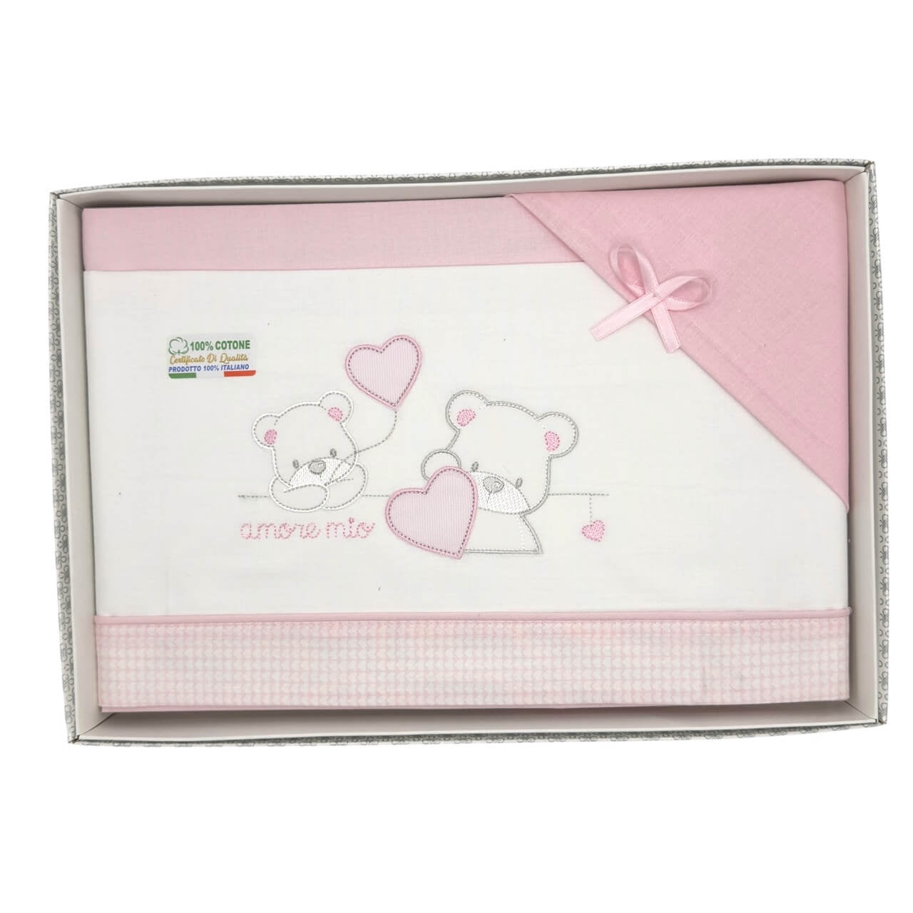 Colorato completo in puro cotone, misura adatta alla culla o alla carrozzina, ricamato con deliziosi soggetti.