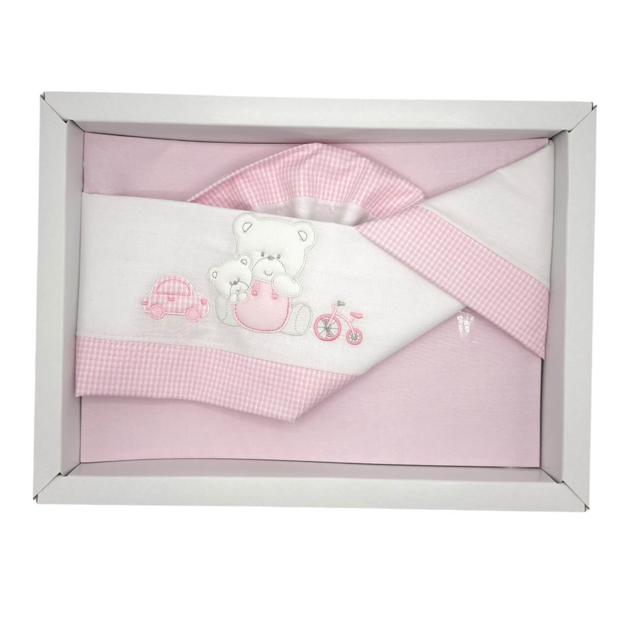 Colorato completo in puro cotone, misura adatta alla culla o alla carrozzina, ricamato con deliziosi soggetti.