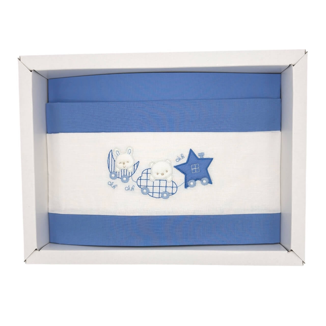 Colorato completo in puro cotone, misura adatta alla culla o alla carrozzina, ricamato con deliziosi soggetti.
