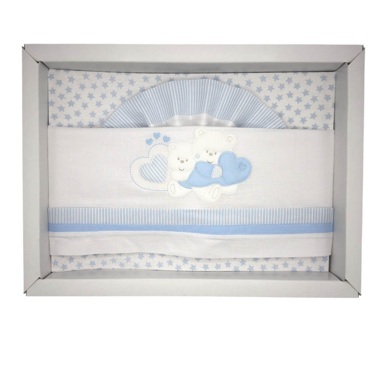 Comprende il lenzuolo di sotto (70x35 cm), il lenzuolo di sopra (80x120 cm) ed una federa (27x37 cm).