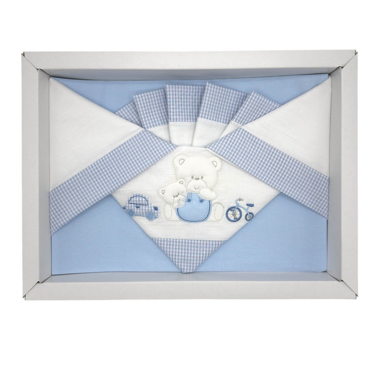 Colorato completo in puro cotone, misura adatta alla culla o alla carrozzina, ricamato con deliziosi soggetti.