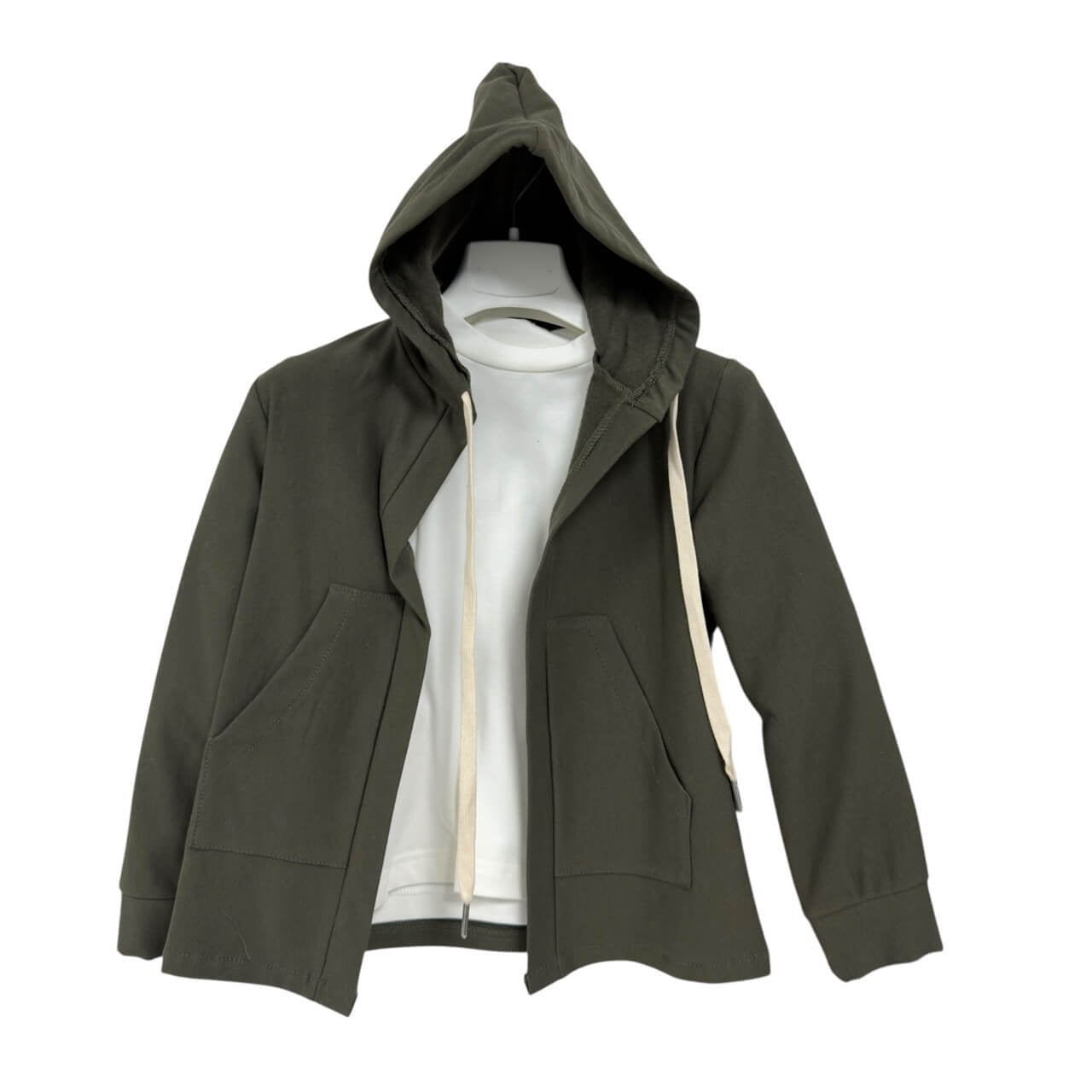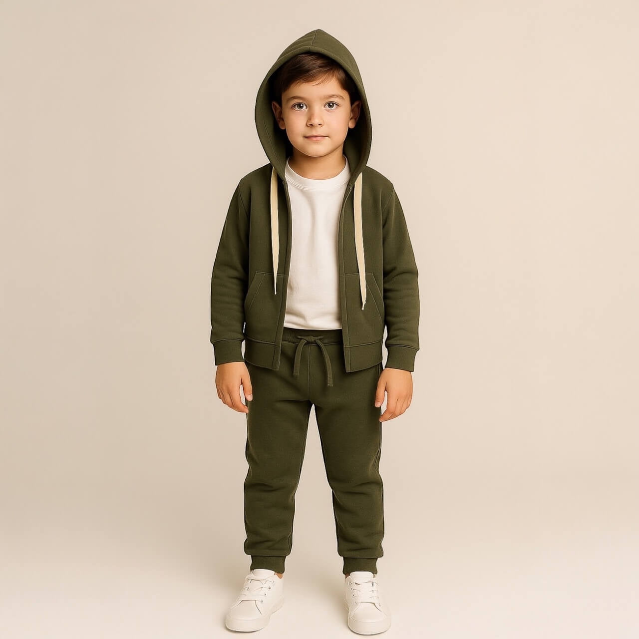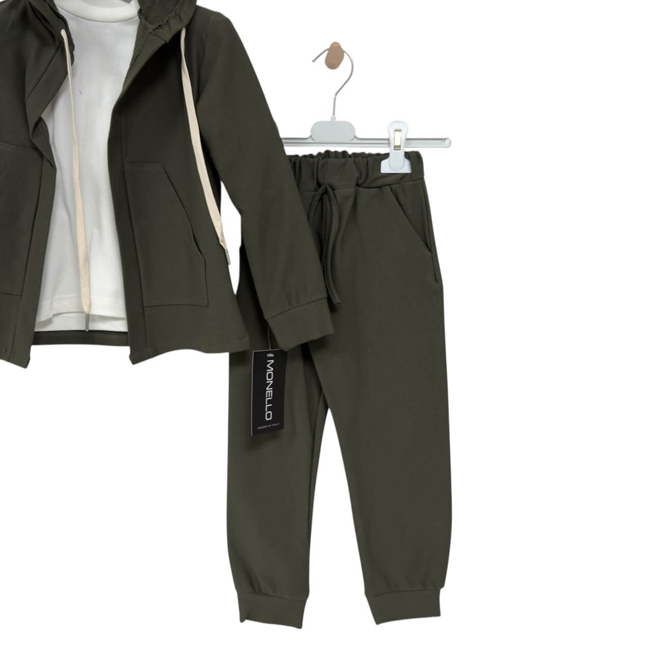 Completo composto da Felpa aperta, abbinata a una t-shirt in cotone e pantalone tuta. Il pantalone presenta elastico in vita con coulisse per il massimo comfort. Un outfit dallo stile moderno e curato nei dettagli, ideale per look casual o più ricercati, garantendo sempre qualità e comfort tipici del Made in Italy.