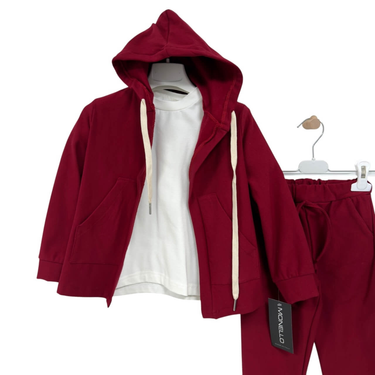 Completo composto da Felpa aperta, abbinata a una t-shirt in cotone e pantalone tuta. Il pantalone presenta elastico in vita con coulisse per il massimo comfort. Un outfit dallo stile moderno e curato nei dettagli, ideale per look casual o più ricercati, garantendo sempre qualità e comfort tipici del Made in Italy.