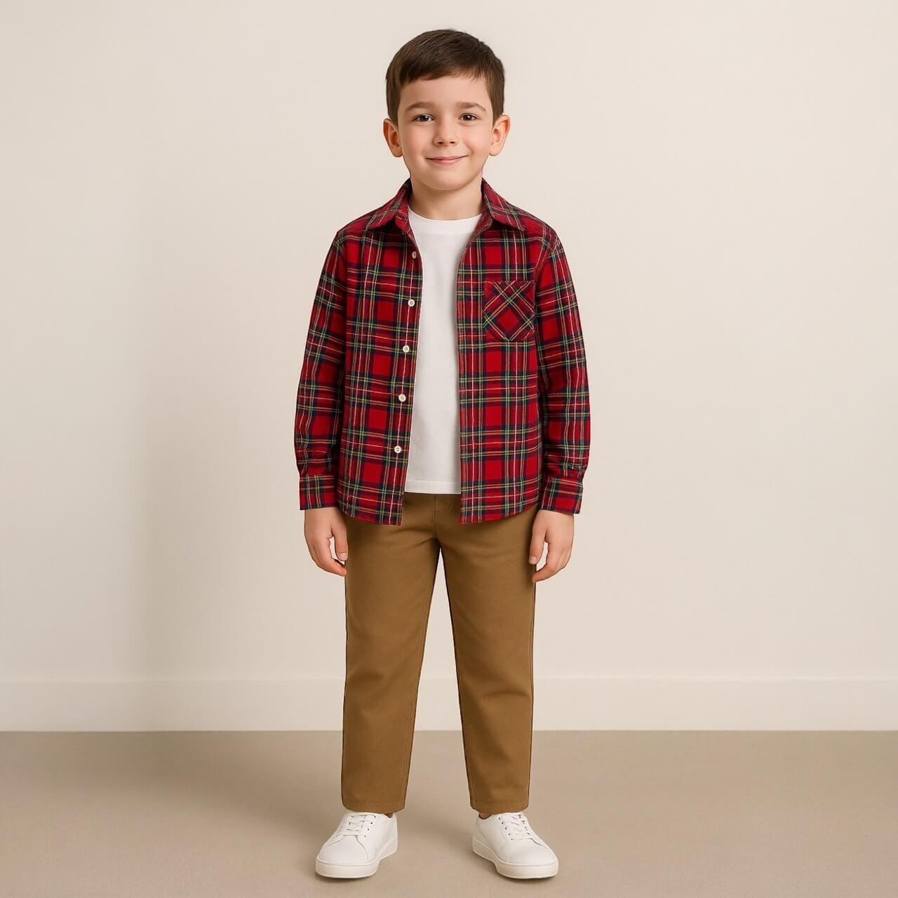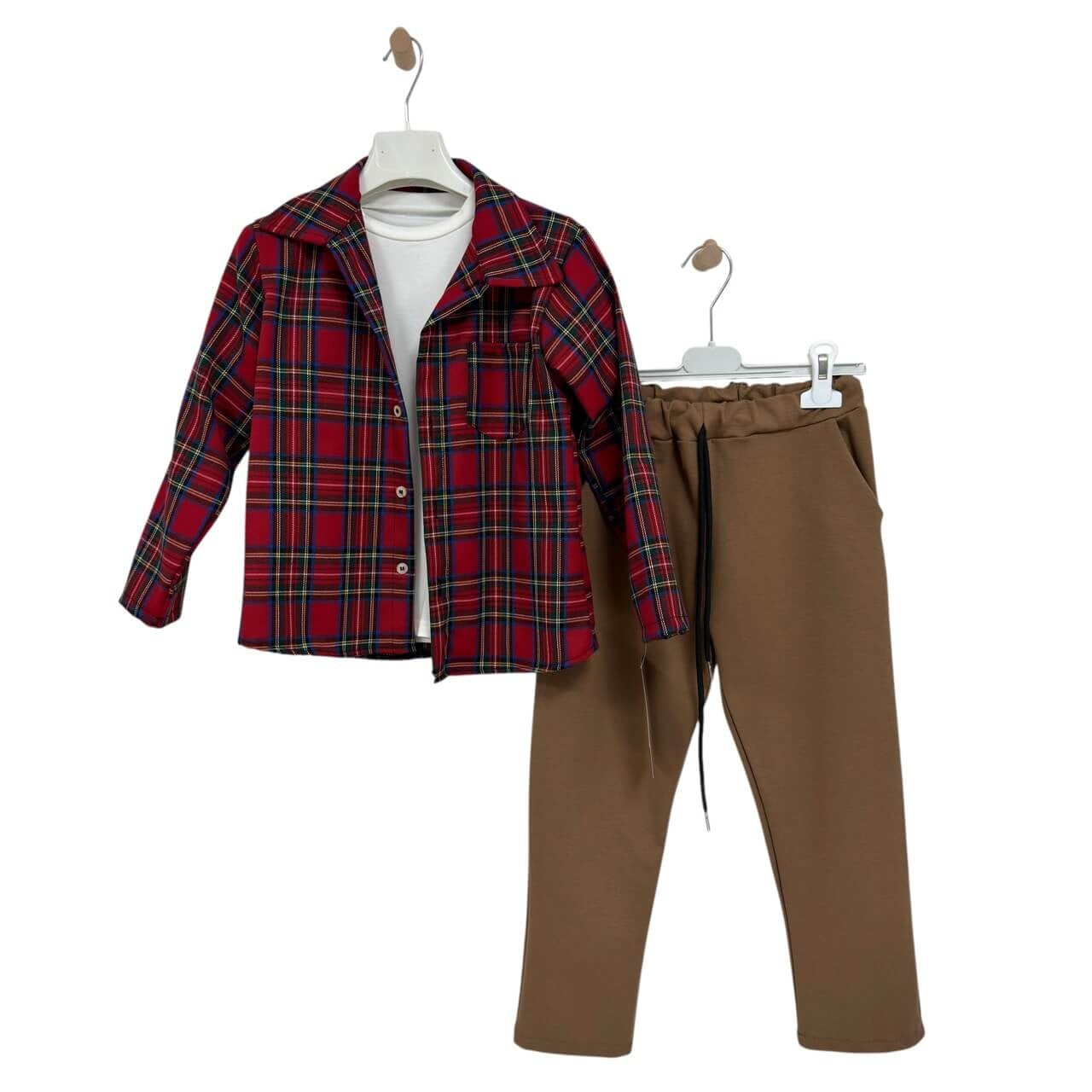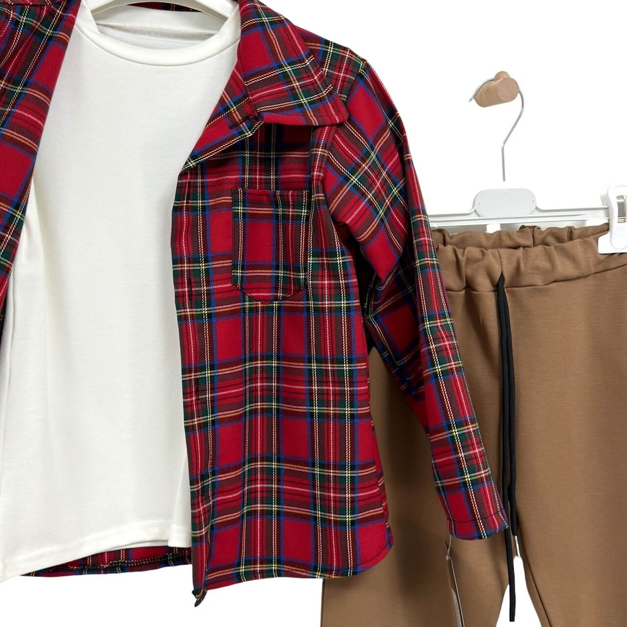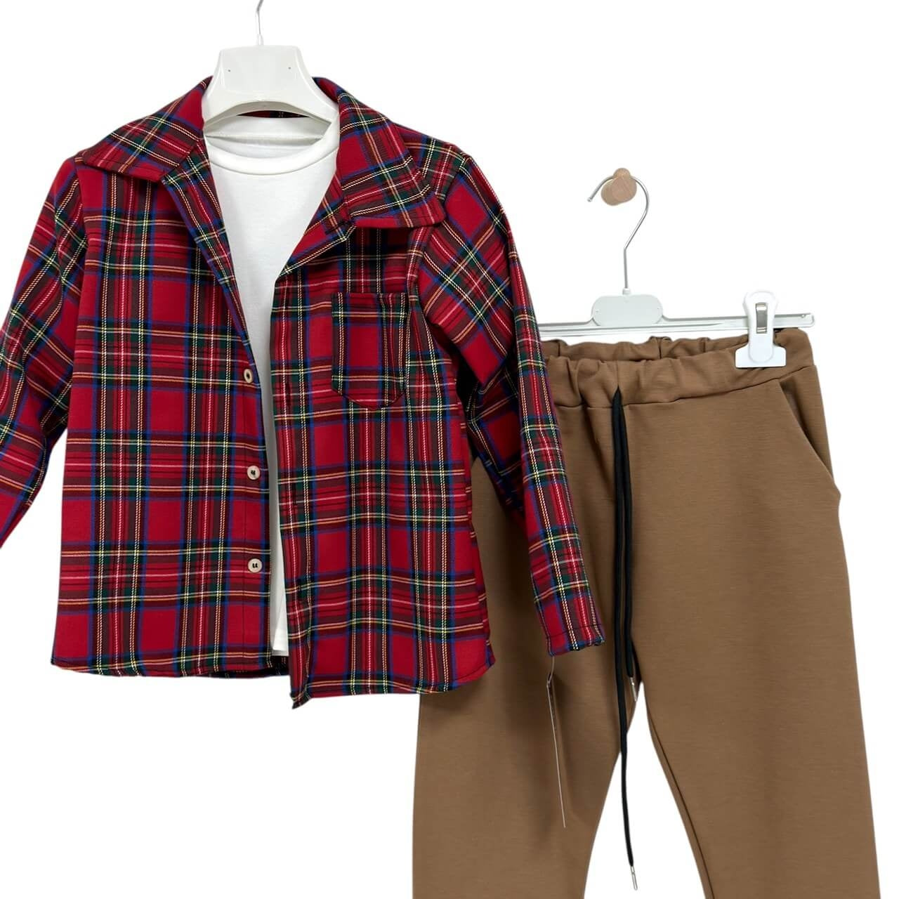 Completo composto da camicia a quadri con colletto classico e chiusura con bottoni, abbinata a una t-shirt in cotone e pantalone con catena decorativa. Il pantalone presenta elastico in vita con coulisse regolabile per il massimo comfort. Un outfit dallo stile moderno e curato nei dettagli, ideale per look casual o più ricercati, garantendo sempre qualità e comfort tipici del Made in Italy.