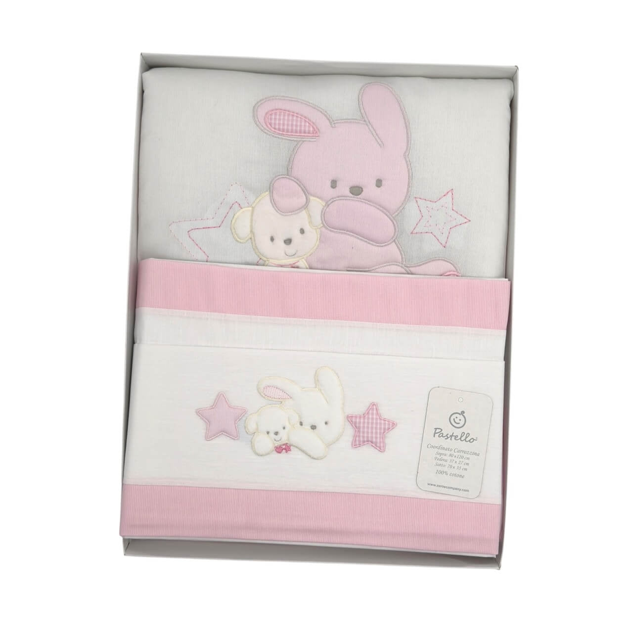 Raffinato completo firmato Pastello, composto da 5 pezzi ideali per il passeggino. Il set include: