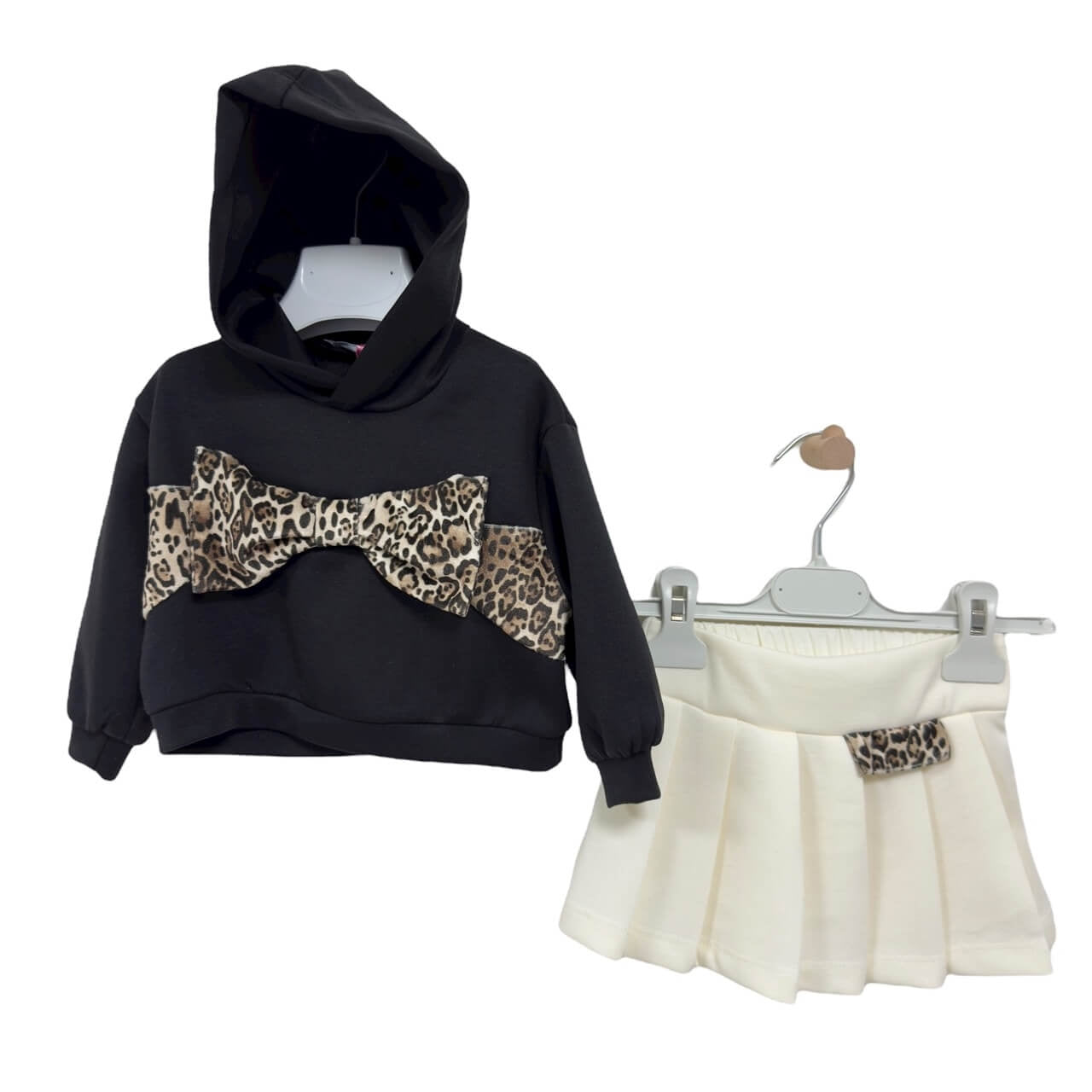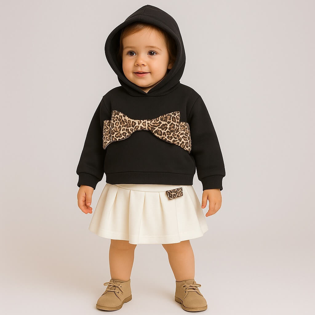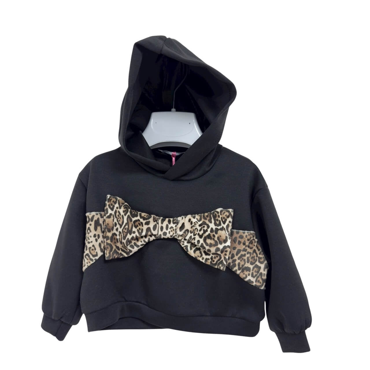Felpa nera con cappuccio, realizzata in tessuto caldo e morbido, arricchita da un maxi fiocco in fantasia animalier leopardata.