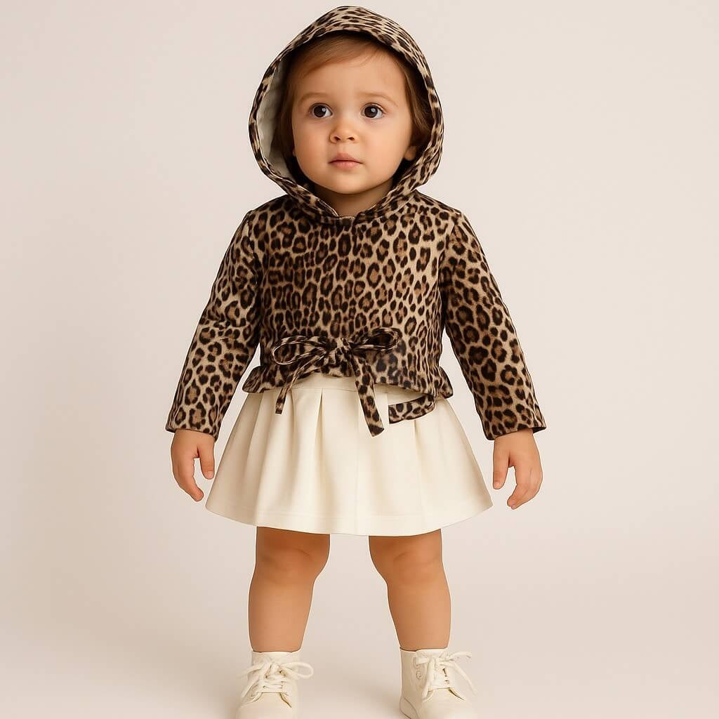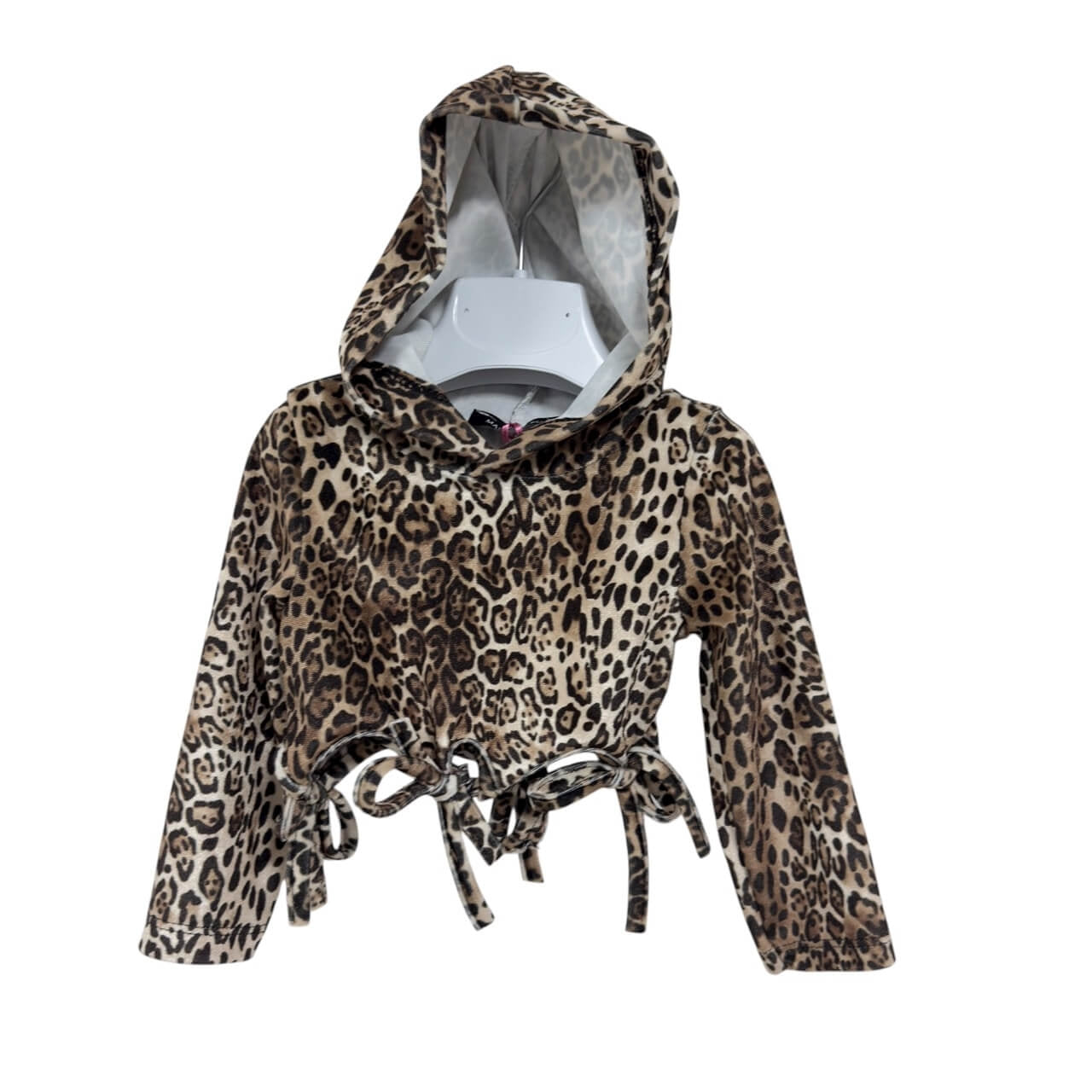 Giacca con cappuccio in morbido tessuto leopardato, con cinturino in vita da annodare per una vestibilità regolabile e un tocco di stile.