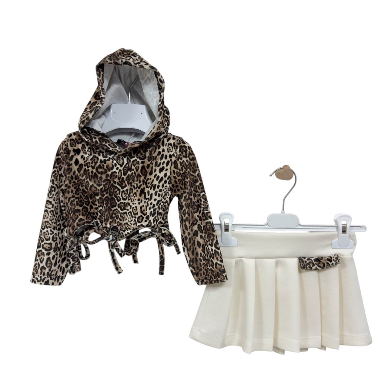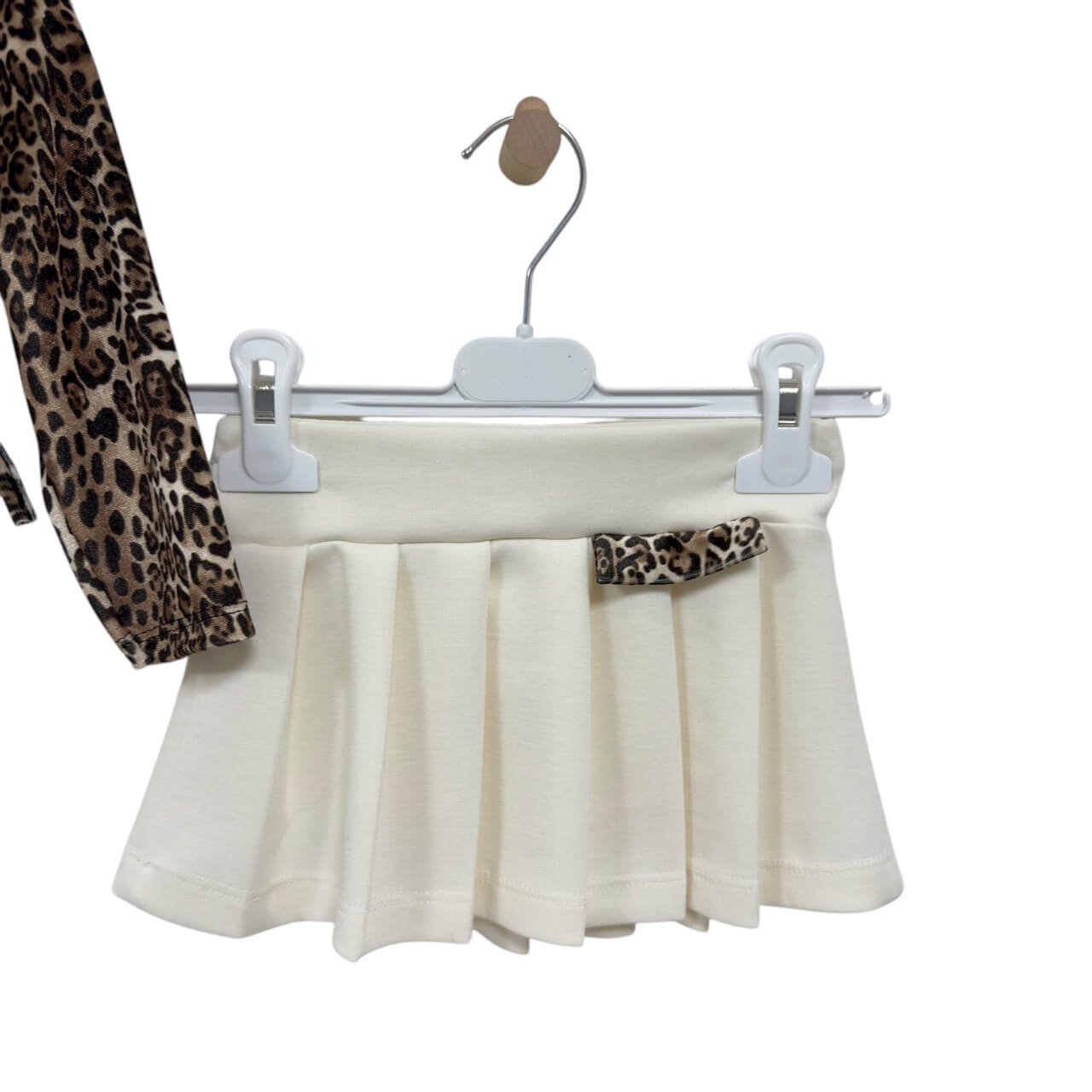 Gonna bianca a pieghe con dettaglio laterale in stampa animalier coordinata.