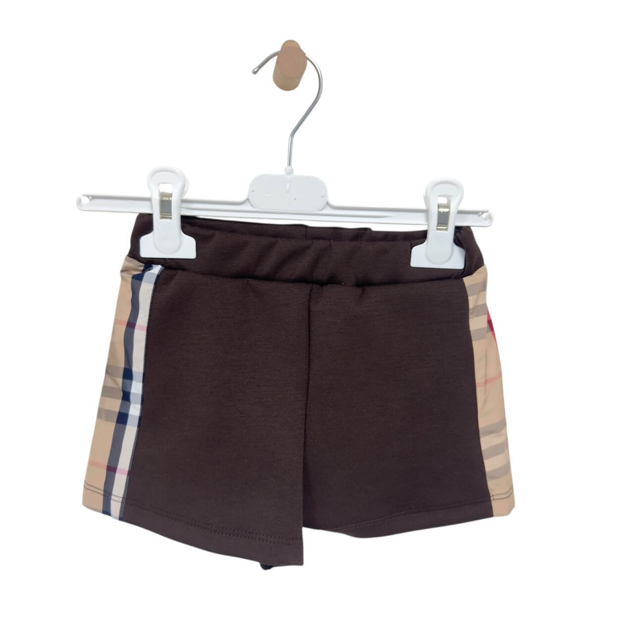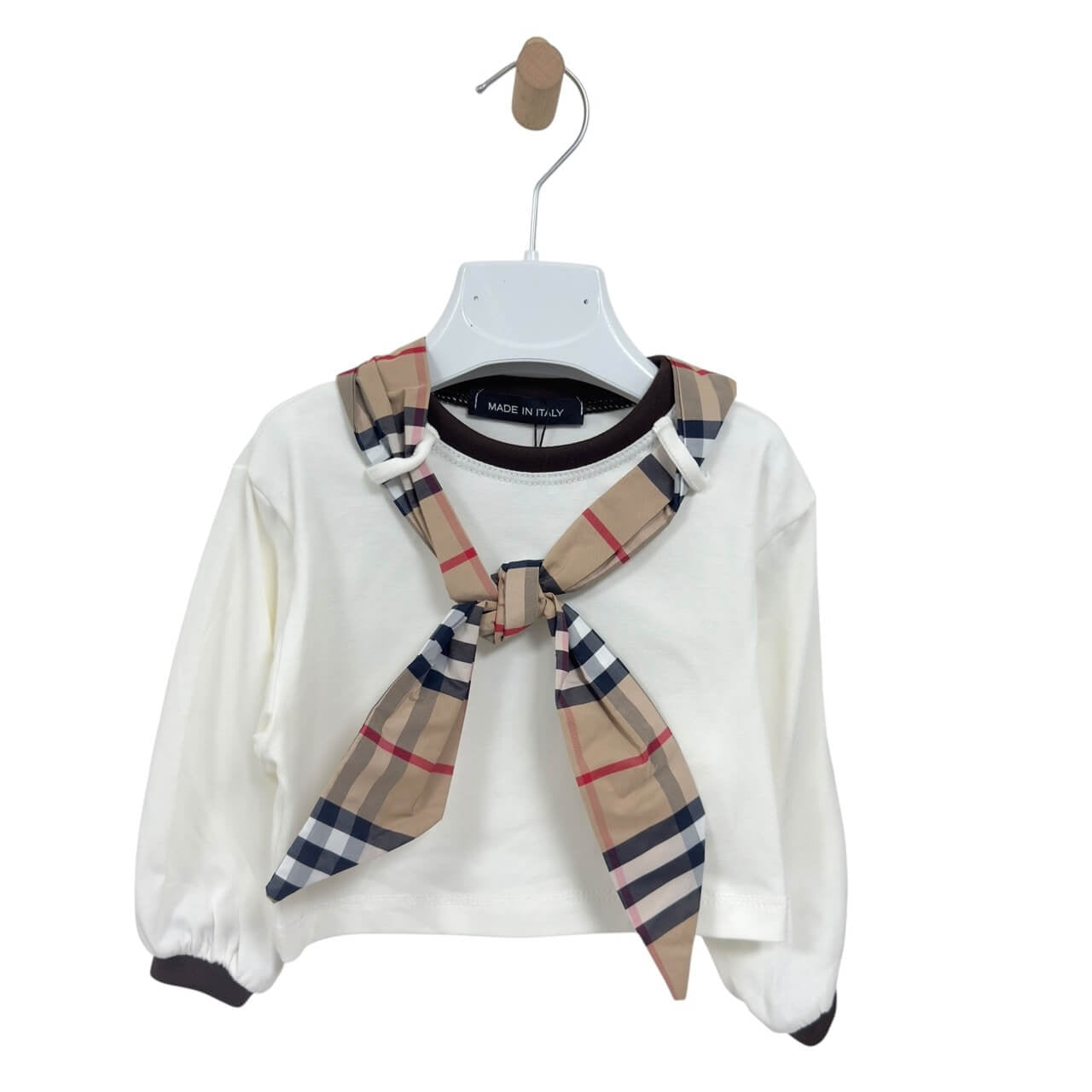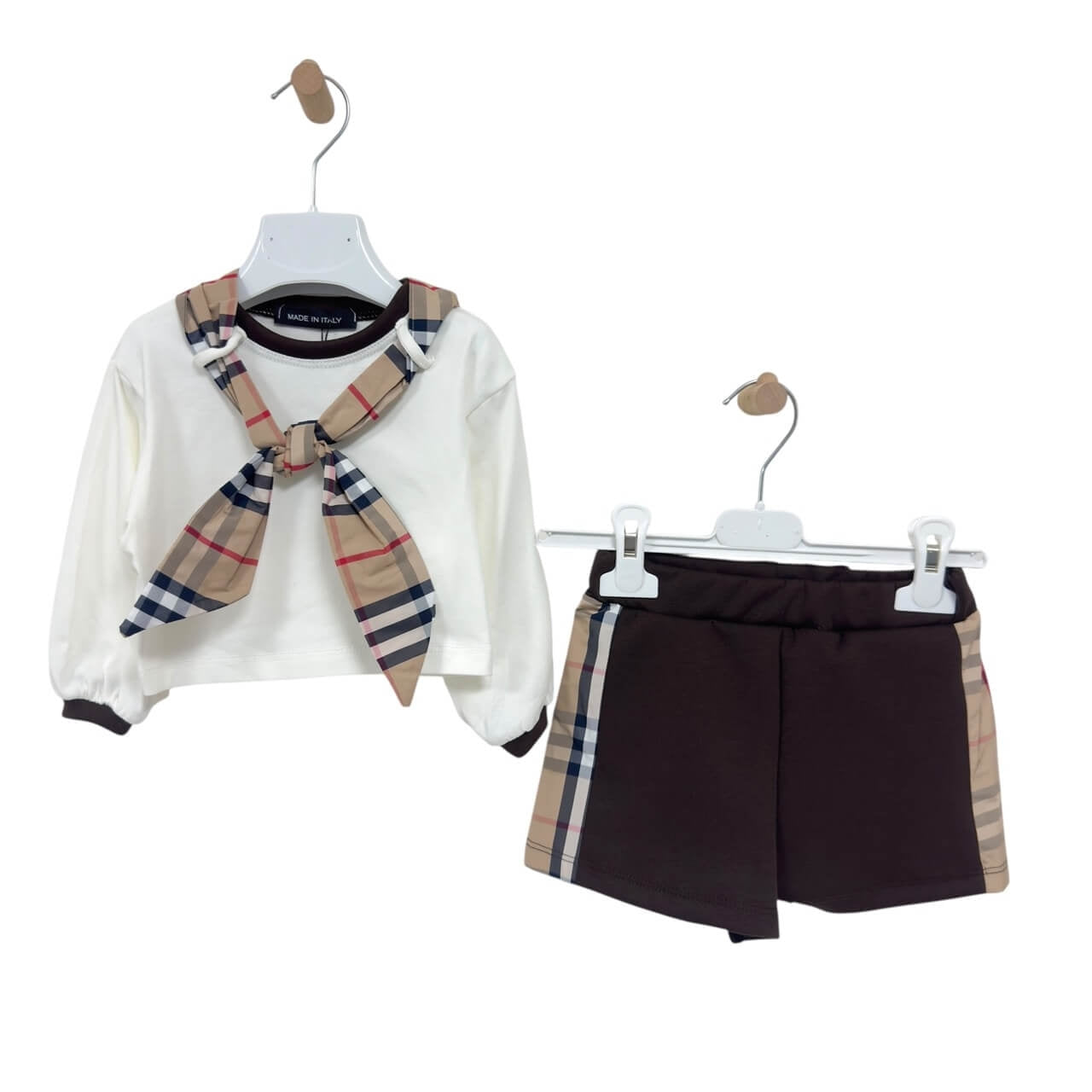 Completo neonato composto da maglia a manica lunga con elegante dettaglio a fiocco e pantaloncini abbinati. Il design presenta inserti con fantasia a quadri e polsini a contrasto per un tocco raffinato e moderno. Realizzato in morbido cotone, assicura comfort e libertà di movimento per tutto il giorno.
