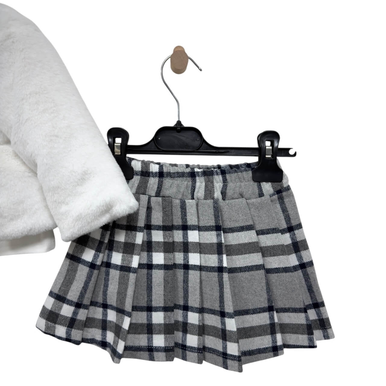 Un raffinato completo composto da maglia in caldo cotone, gonna a pieghe e giacchino in pelliccia ecologica. Un look elegante e confortevole, perfetto per le occasioni speciali e le giornate più fresche. Il set unisce morbidezza, qualità dei materiali e cura nei dettagli tipici del brand Camilla.