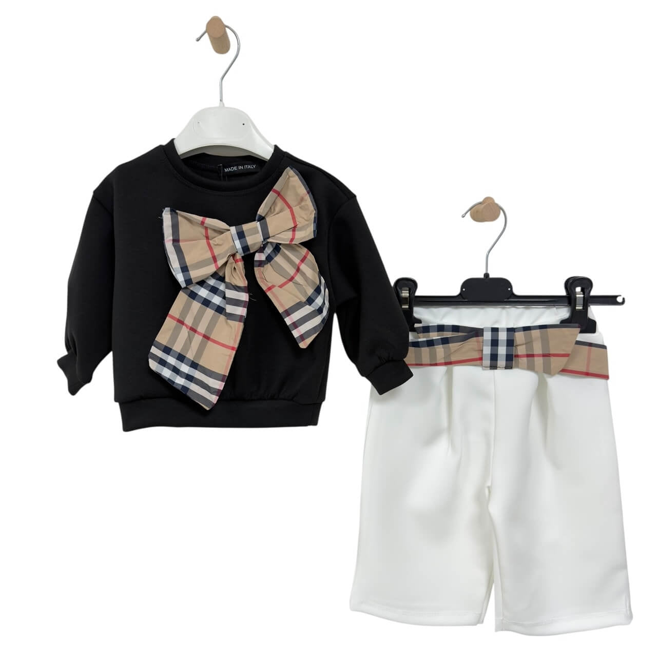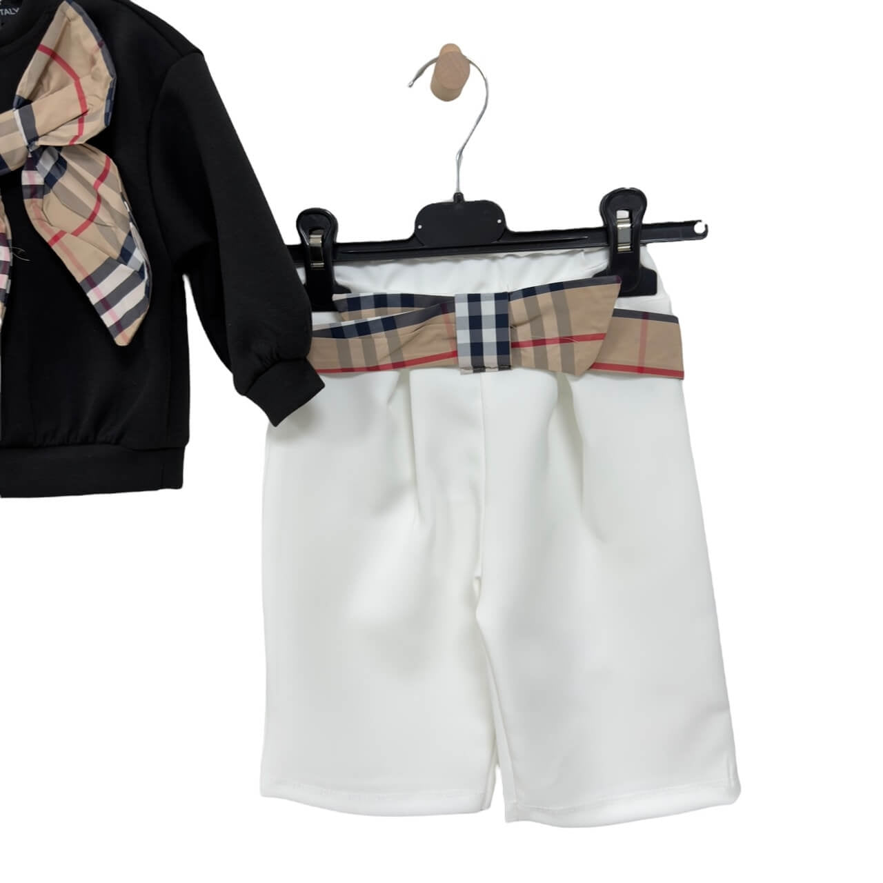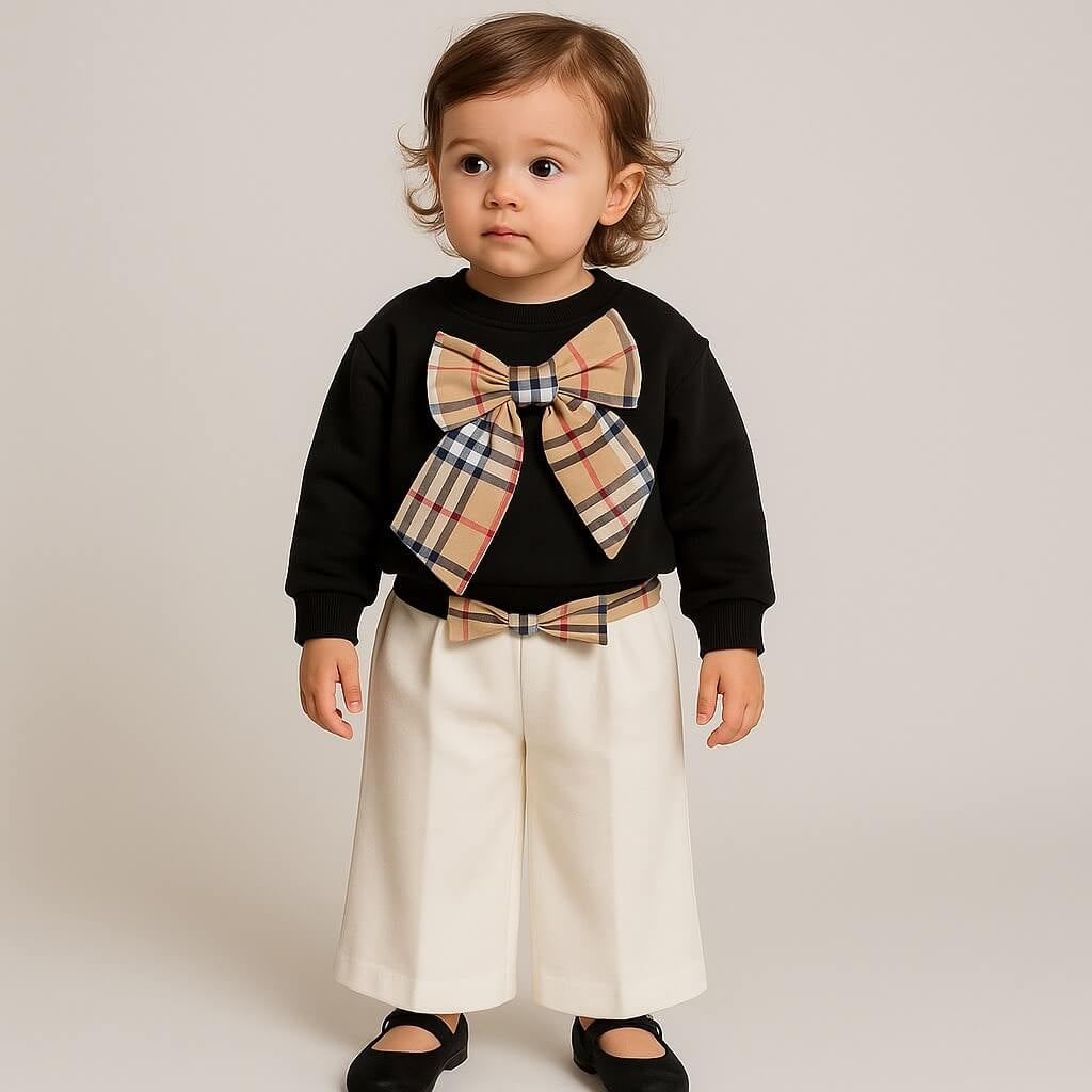 Felpa panna a maniche lunghe con maxi fiocco applicato in fantasia check scozzese, che dona un tocco chic e raffinato.