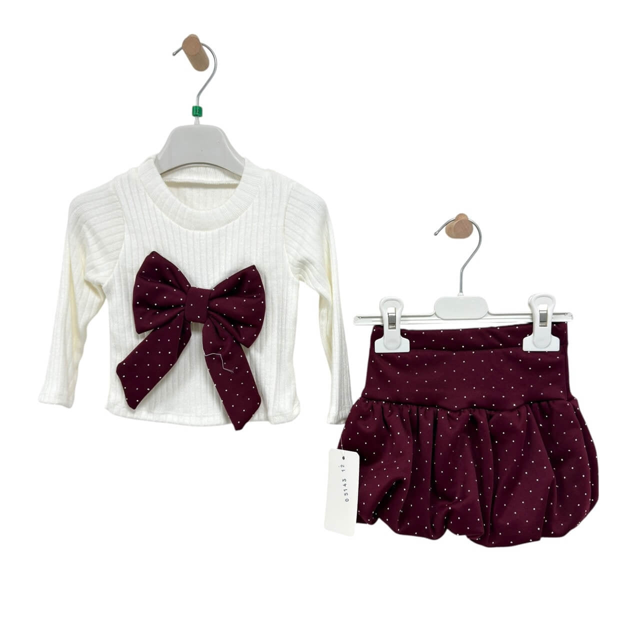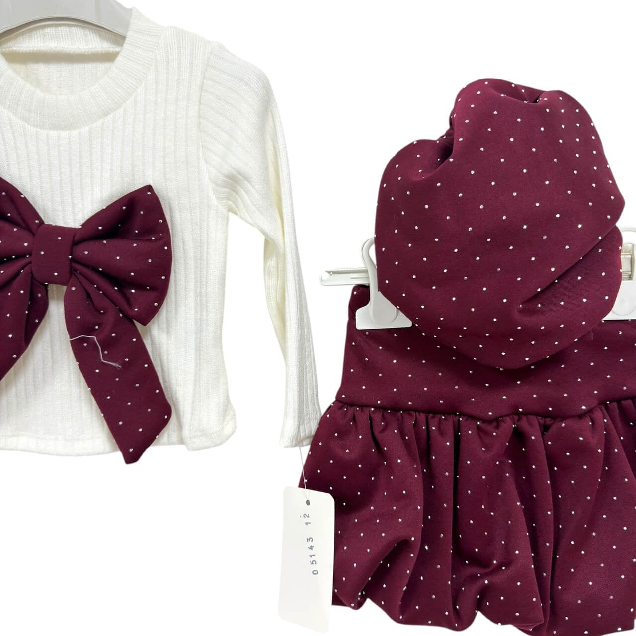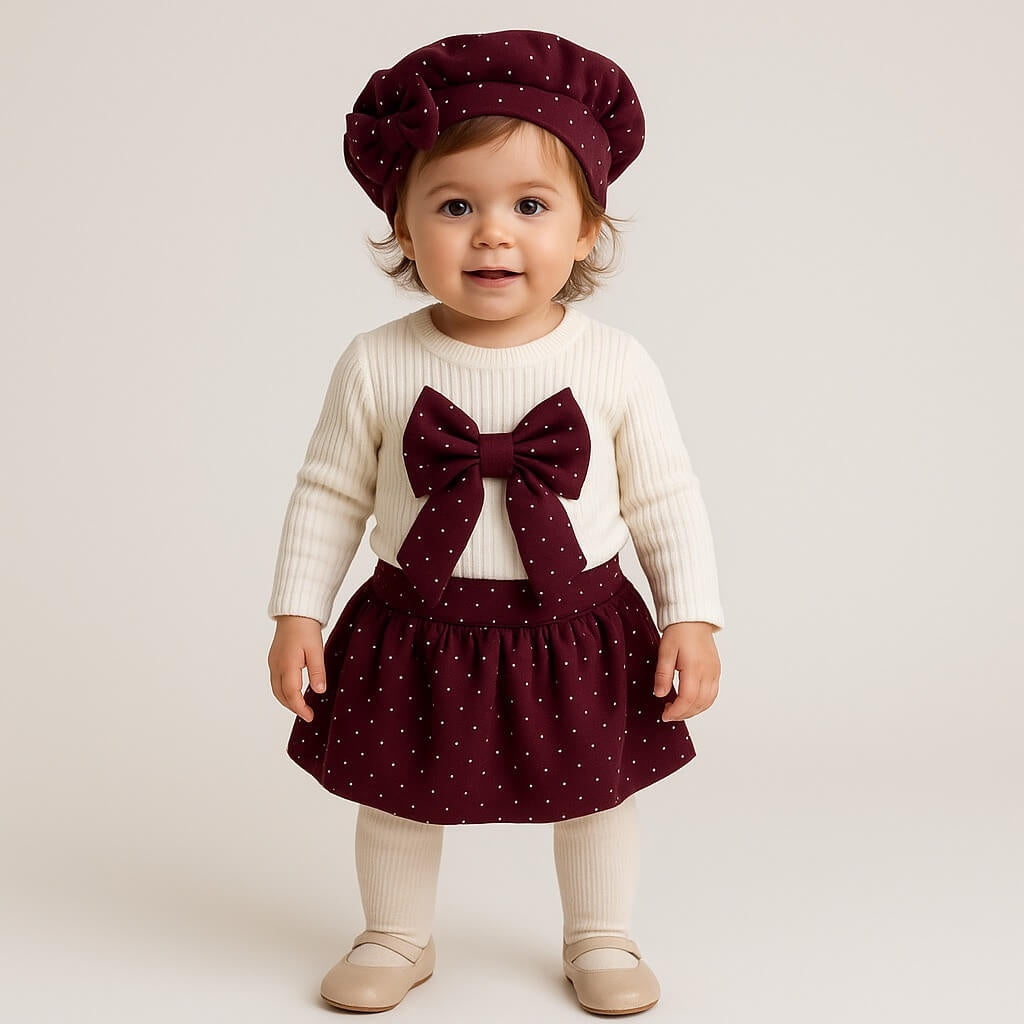 Questo dolcissimo completo firmato Sweet Fun è pensato per far risaltare tutta la tenerezza e l’eleganza delle più piccole. Composto da maglia, gonna e basco coordinato, è ideale per cerimonie, feste, servizi fotografici e giornate speciali.