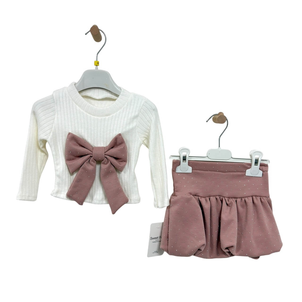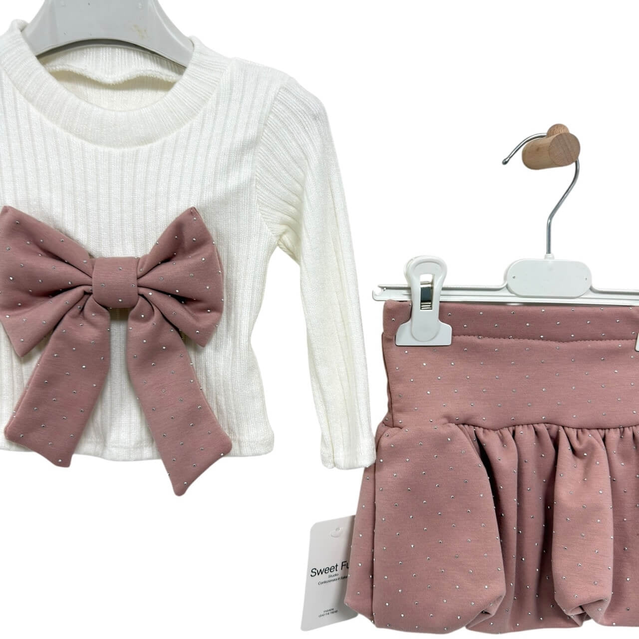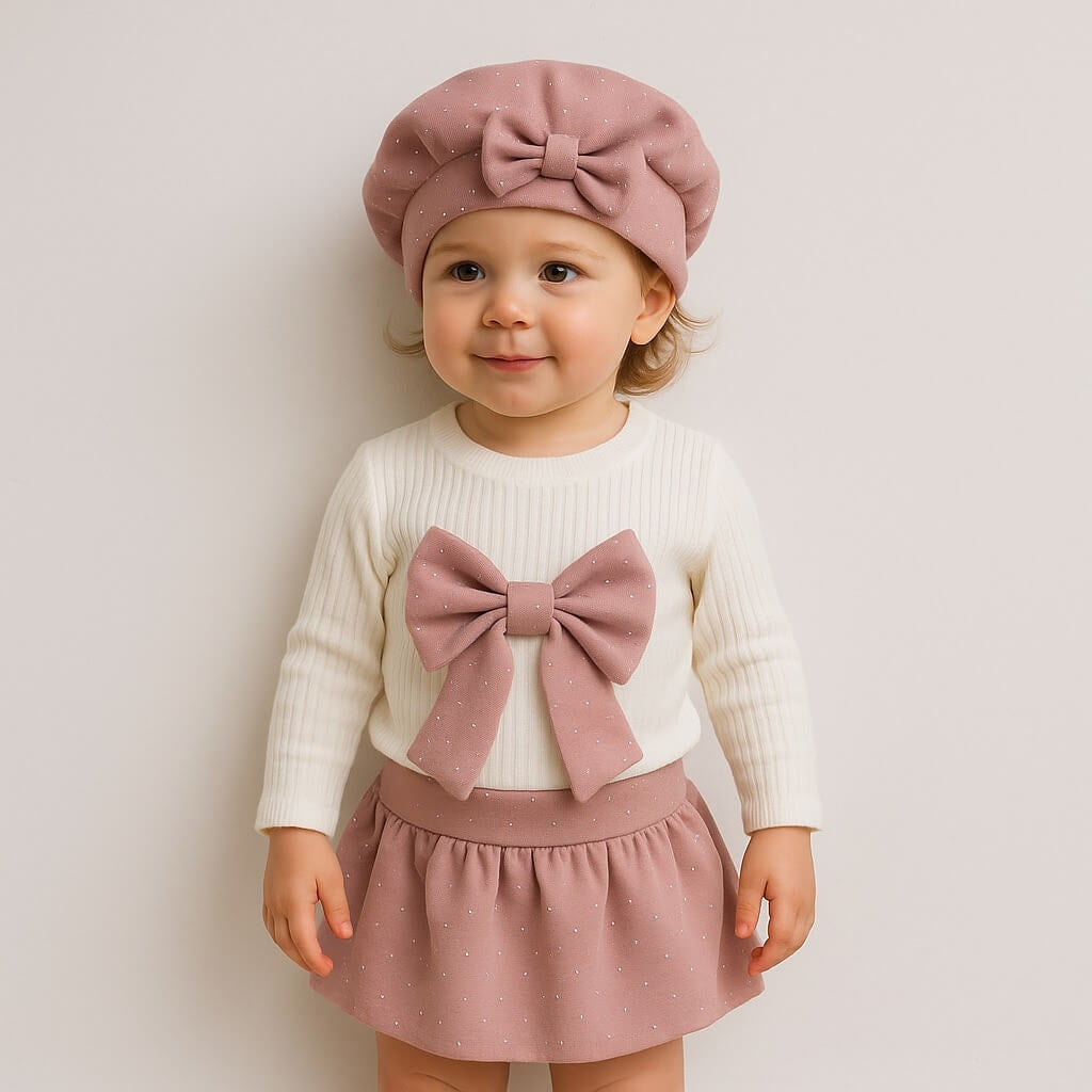 Questo dolcissimo completo firmato Sweet Fun è pensato per far risaltare tutta la tenerezza e l’eleganza delle più piccole. Composto da maglia, gonna e basco coordinato, è ideale per cerimonie, feste, servizi fotografici e giornate speciali.