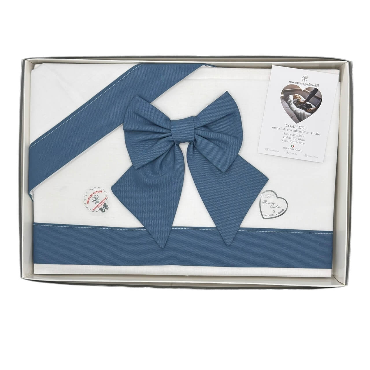 Completo lenzuola 3 pezzi in 100% puro cotone , il set lenzuola è misura maxi compatibile con le misure culla next to me. Misure: Lenzuolo sopra 80x120 cm - Sottolenzuola con angoli 50x82x12 cm - Federa cuscino 30x40 cm. Prodotto ideato, tessuto e confezionato in Italia.Il lavaggio può essere effettuato a mano o in lavatrice ad una temperatura massima che non superi i 40°C.