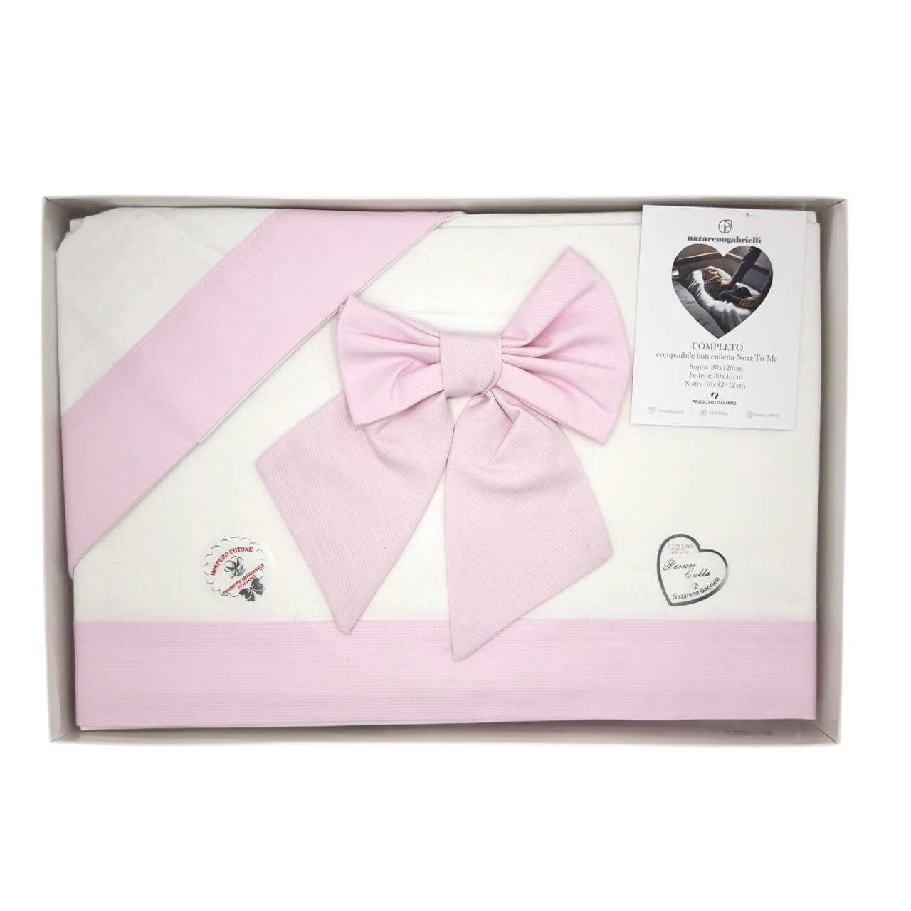 Completo lenzuola 3 pezzi in 100% puro cotone , il set lenzuola è misura maxi compatibile con le misure culla next to me. Misure: Lenzuolo sopra 80x120 cm - Sottolenzuola con angoli 50x82x12 cm - Federa cuscino 30x40 cm. Prodotto ideato, tessuto e confezionato in Italia.Il lavaggio può essere effettuato a mano o in lavatrice ad una temperatura massima che non superi i 40°C.