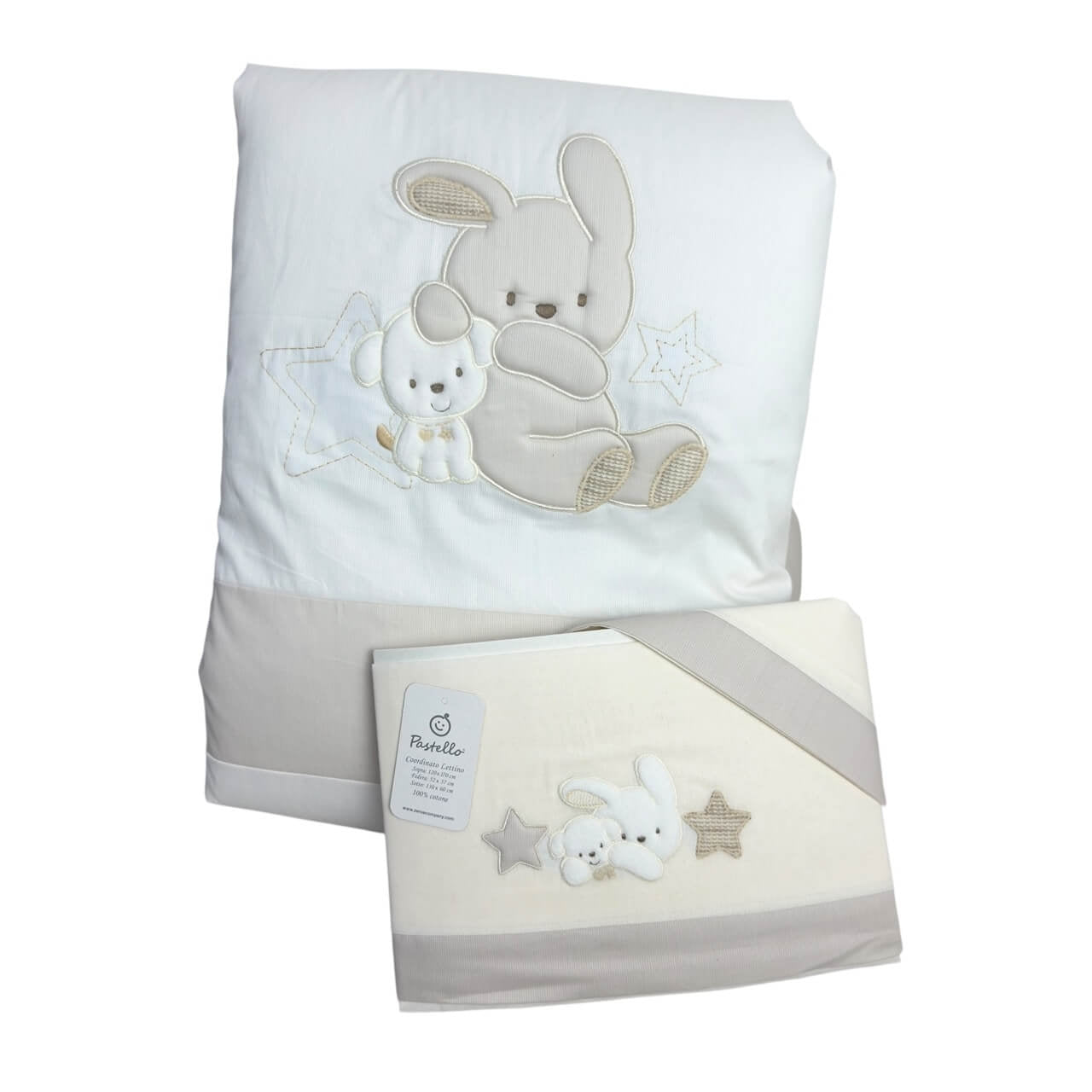 Set per culla grande composto da trapunta sfoderabile e lenzuola coordinate. Realizzato con tessuti morbidi e resistenti, offre comfort e praticità durante il riposo del bambino. La trapunta sfoderabile consente un lavaggio semplice e veloce, garantendo sempre igiene e freschezza. Il set di lenzuola completa il corredo, rendendolo funzionale e adatto all’uso quotidiano.