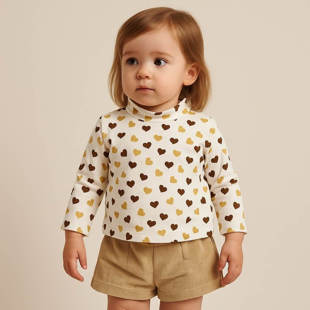 • Maglia bianca a collo alto con fantasia a cuoricini nei toni del marrone e del senape, realizzata in morbido cotone elasticizzato