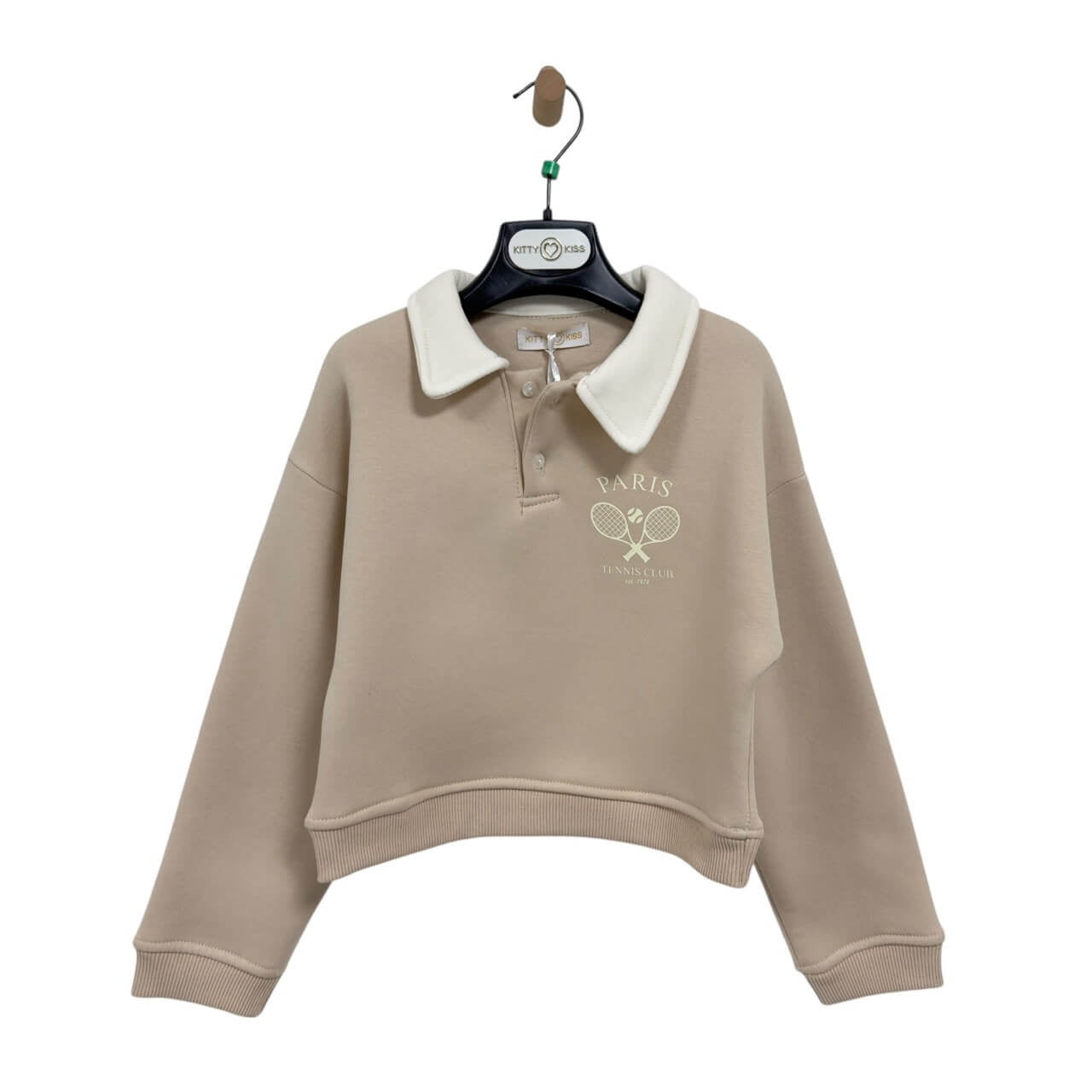 Felpa da bambina con collo polo e apertura a bottoni sul davanti. La grafica frontale presenta un motivo sportivo ispirato al tennis, con scritta decorativa e racchette stilizzate. Il modello ha vestibilità comoda, polsini e fondo a costine per un maggiore comfort. Perfetta per un look casual e alla moda, ideale per l’uso quotidiano.