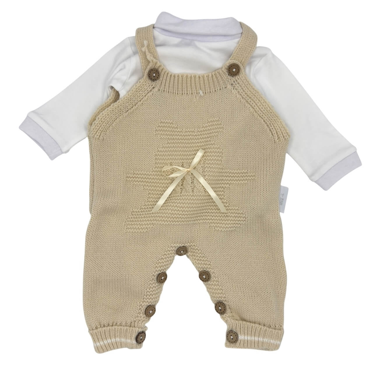 Completo neonato del marchio Melanie, disponibile nelle taglie 1-3 e 3-6 mesi. Realizzato in morbido tessuto acrilico, è composto da salopette lavorata a maglia con dettagli raffinati e bottoncini pratici, abbinata a un bodino a maniche lunghe in cotone. Confezionato in elegante scatola, è una scelta ideale per corredino o come idea regalo.